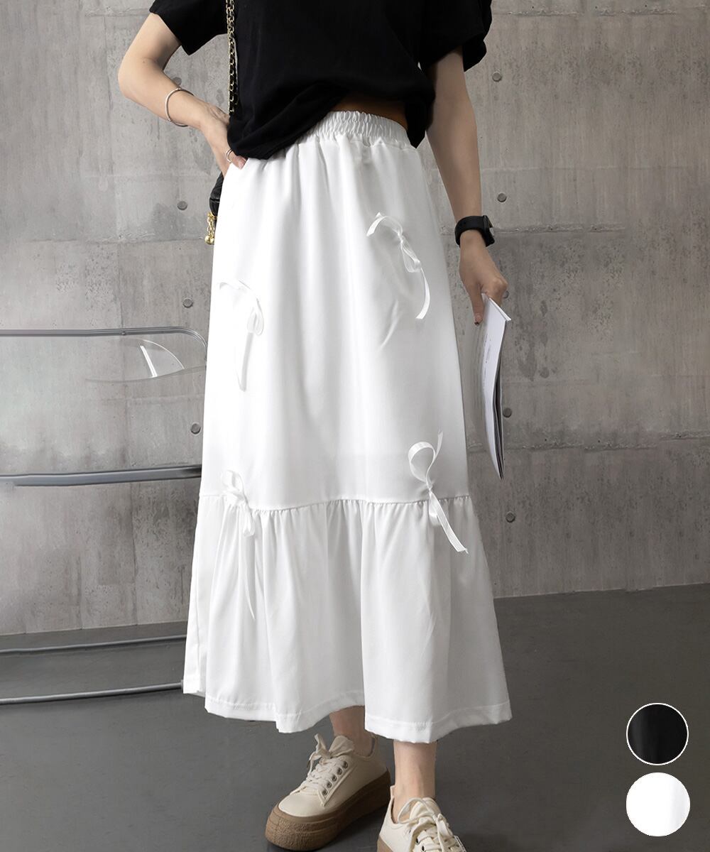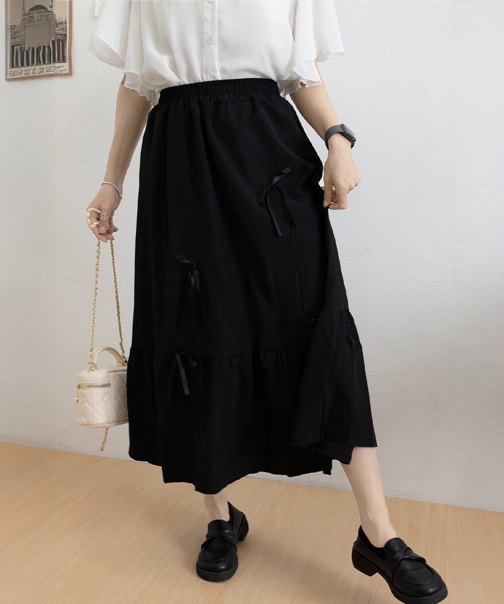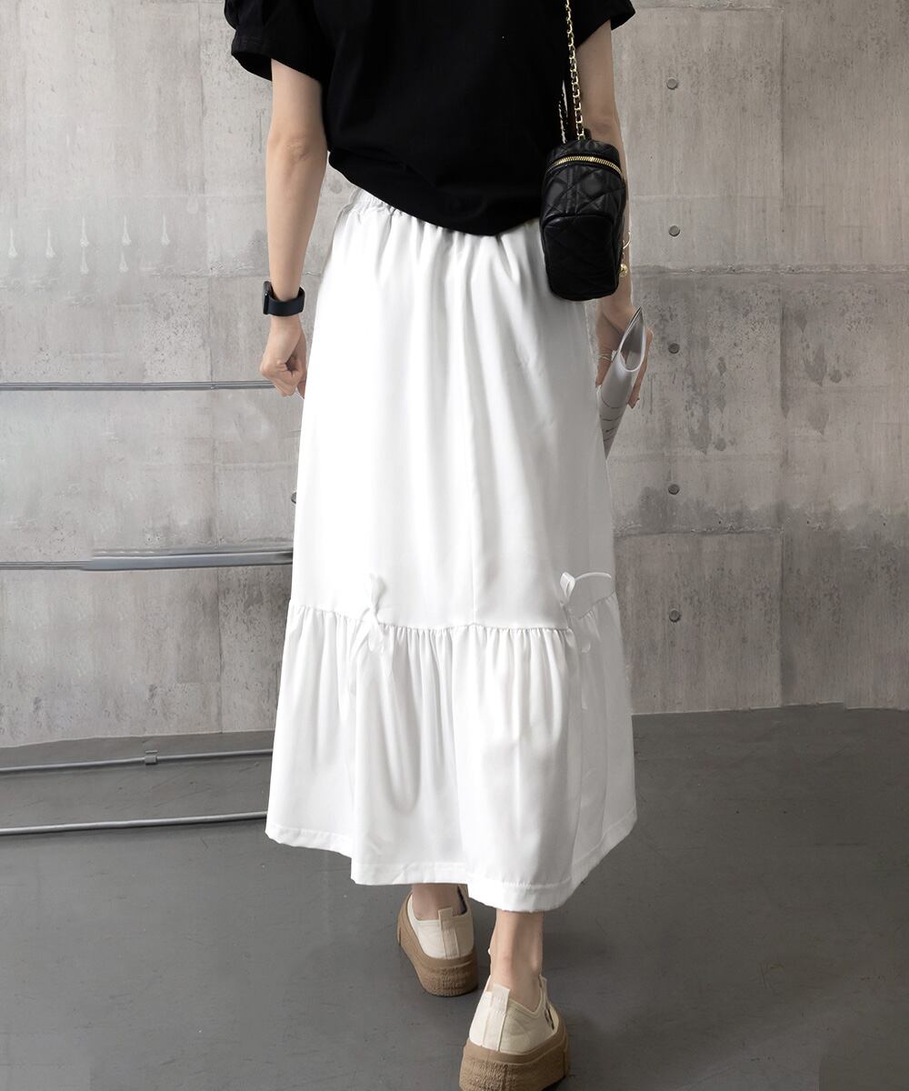 優しい雰囲気のリボンディテールで甘さを引き立てるロングスカート。