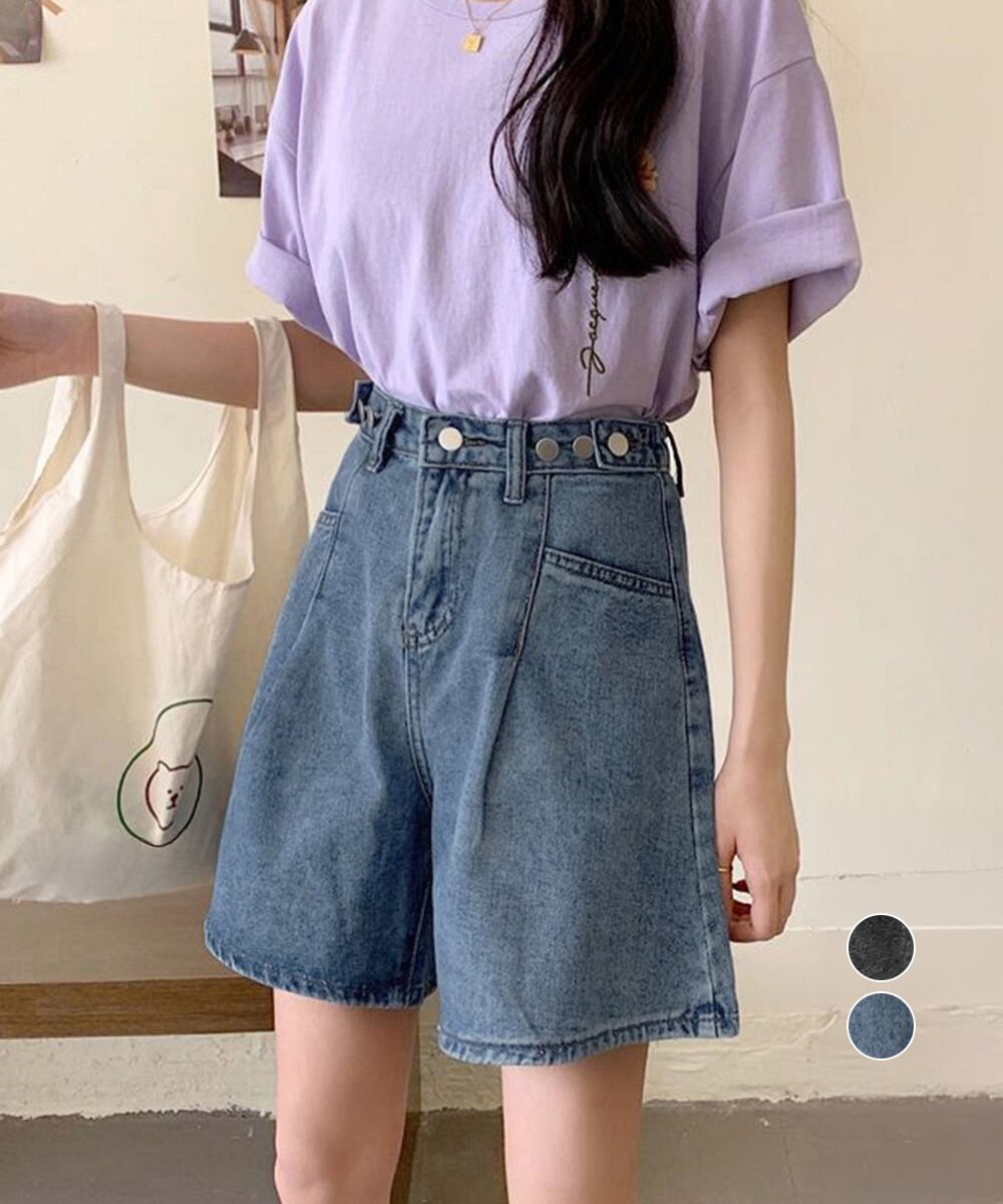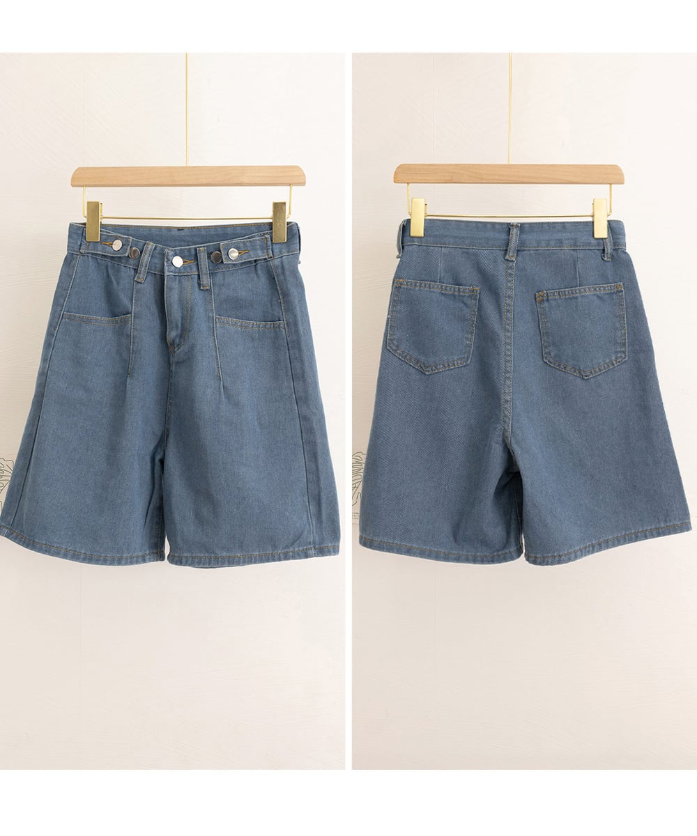 ウエストのボタンでサイズ調節が可能な、ハイウエストデニムハーフパンツ