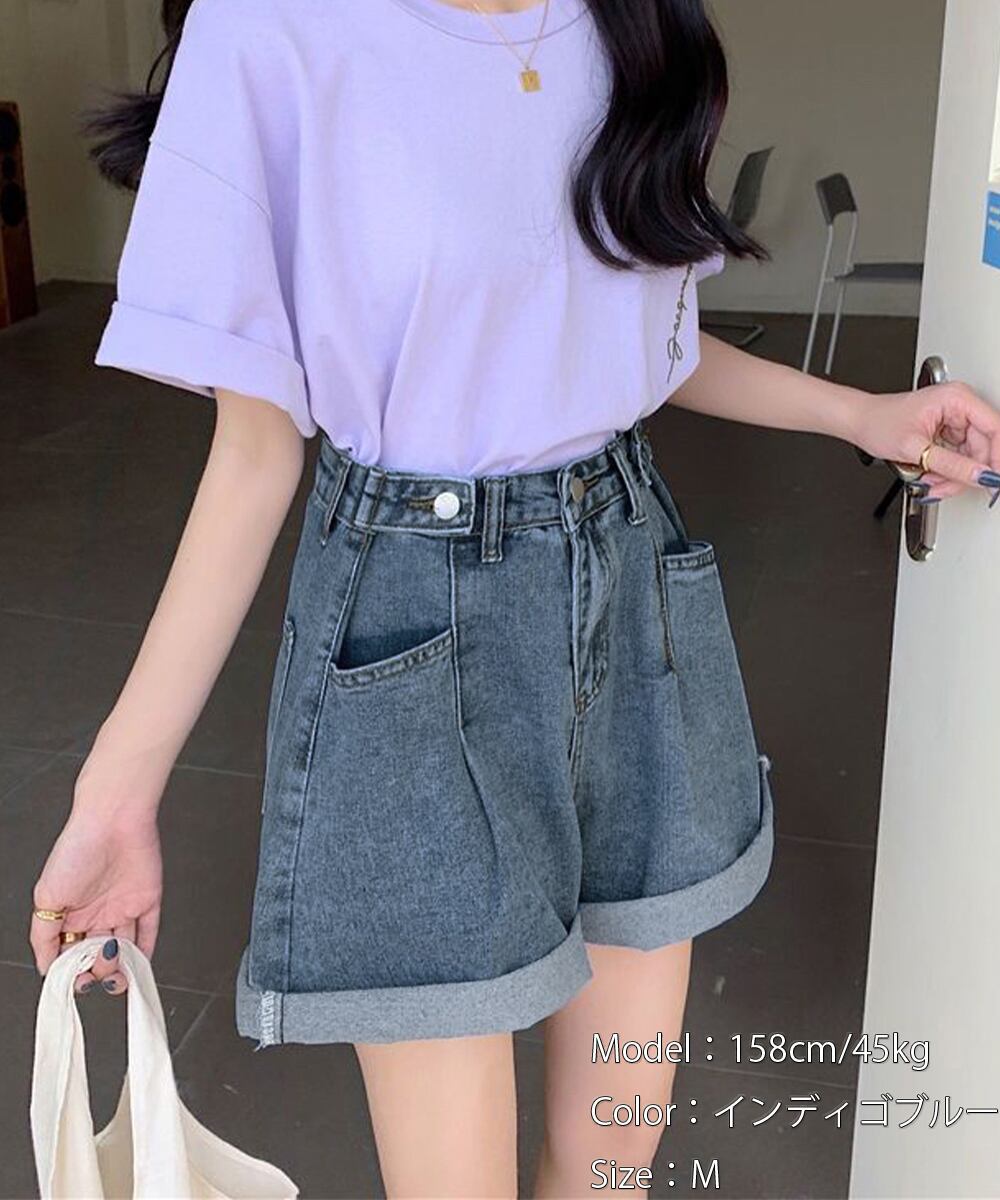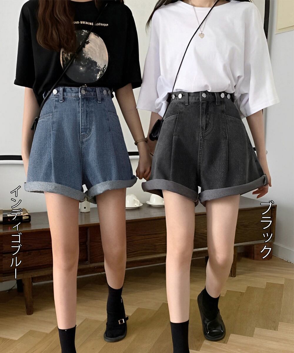 レディース ハイウエストショーパン ロールアップ 着やせボトムス レトロ デニム短パン細見え 裾ロールアップ オルチャン