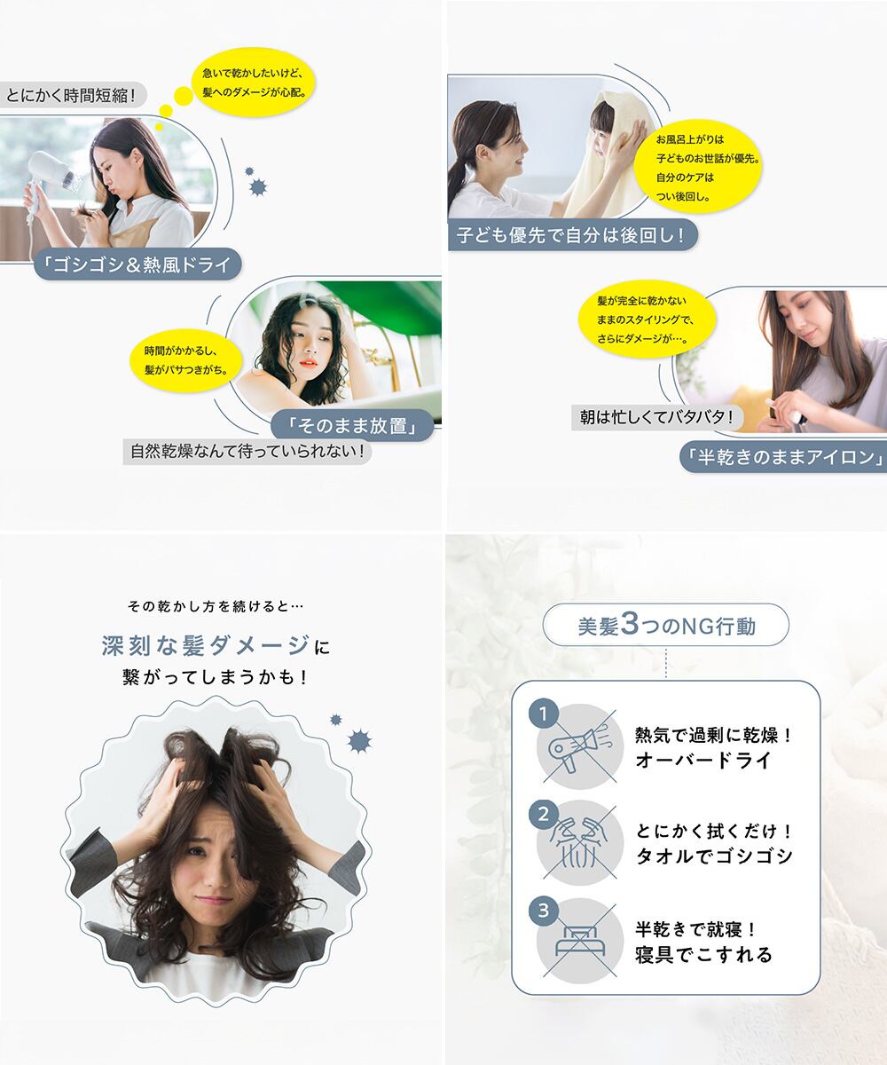 自然乾燥は髪を傷める原因に。時短でしっかり乾かして、パサつきも防止。