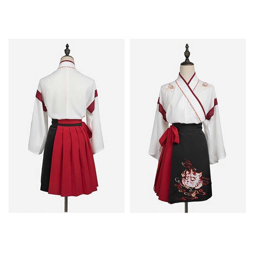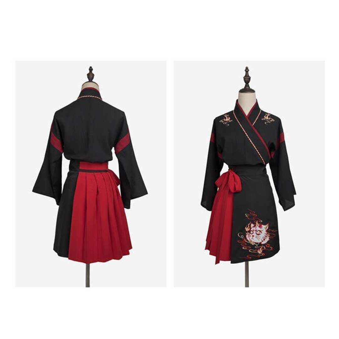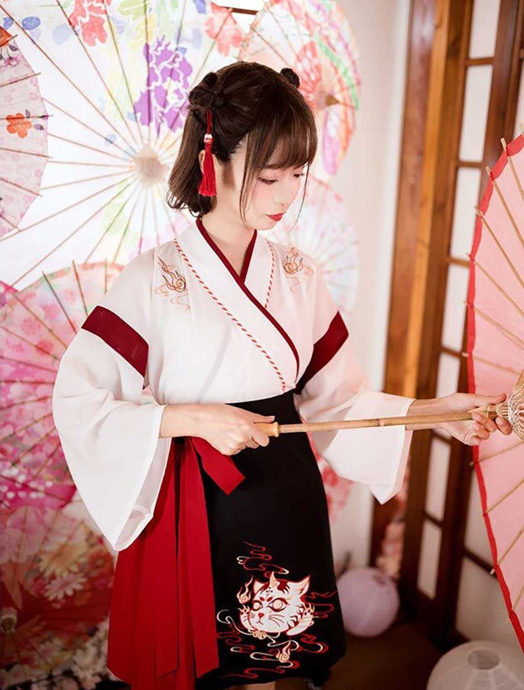 和服 猫 ツノ トップス スカート 上下セット ホワイトorブラック 和装 サクラ ダンス衣装 韓国ファッション