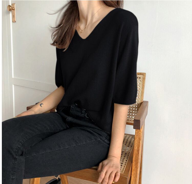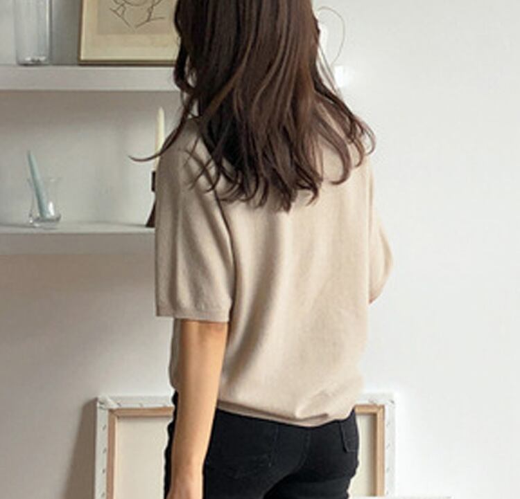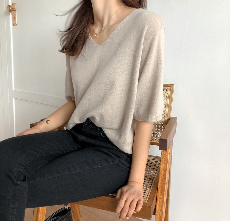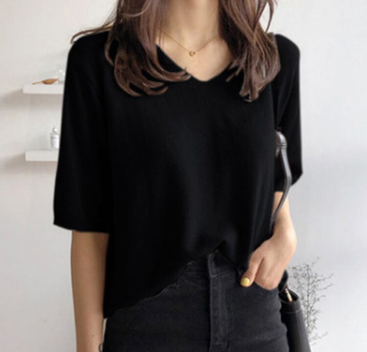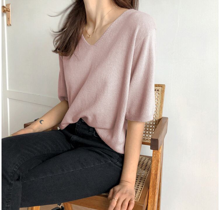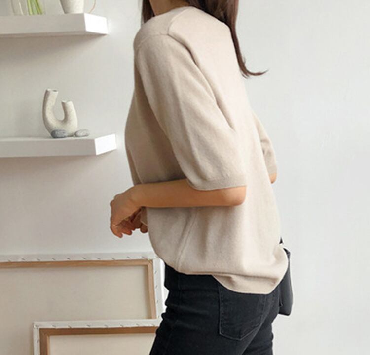 【海外からの取り寄せ】2021春夏新作 大人可愛い トレンド Vネック サマーニット 5分袖 シャツ 無地 着回し トップス 体系カバー #[shirt274_12800]【送料込み】【250712】