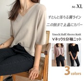 すとんと落ちる肩ライン二の腕まで上品にカバー Vネック5分袖ニット