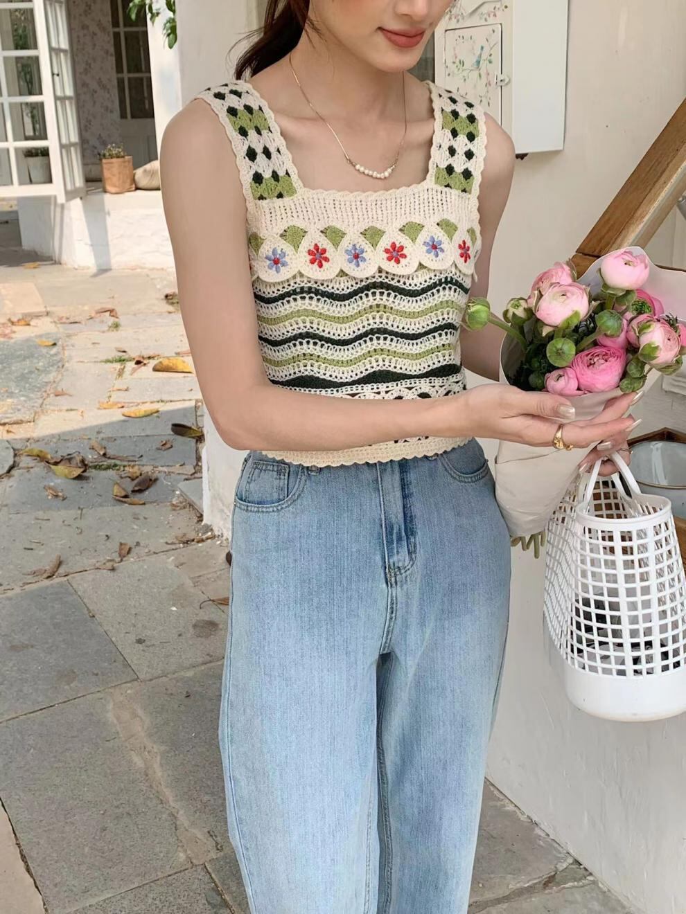 【海外からの取り寄せ】2023新作 レディース トレンド トップス サマーニット 大人ガーリー キャミソール カギ編み 刺繍 花 #[shirt386_12800]【送料込み】【250712】