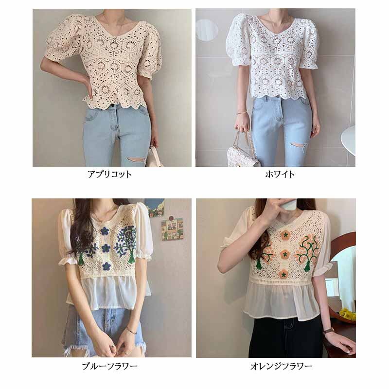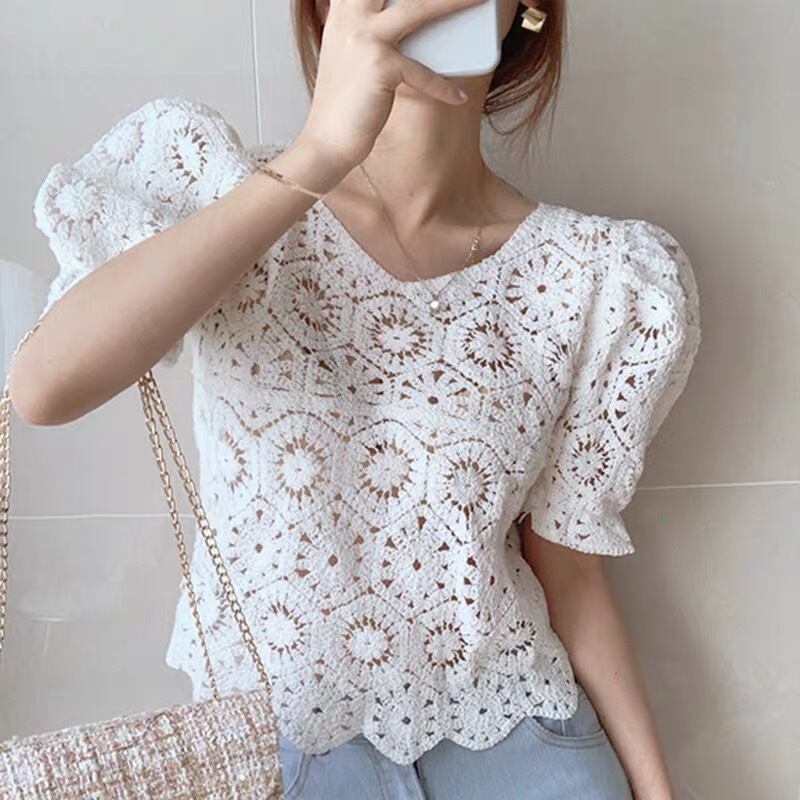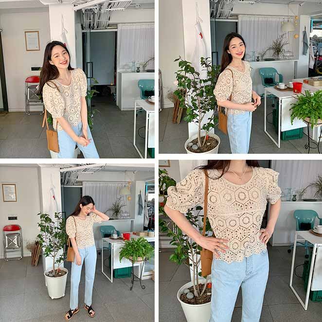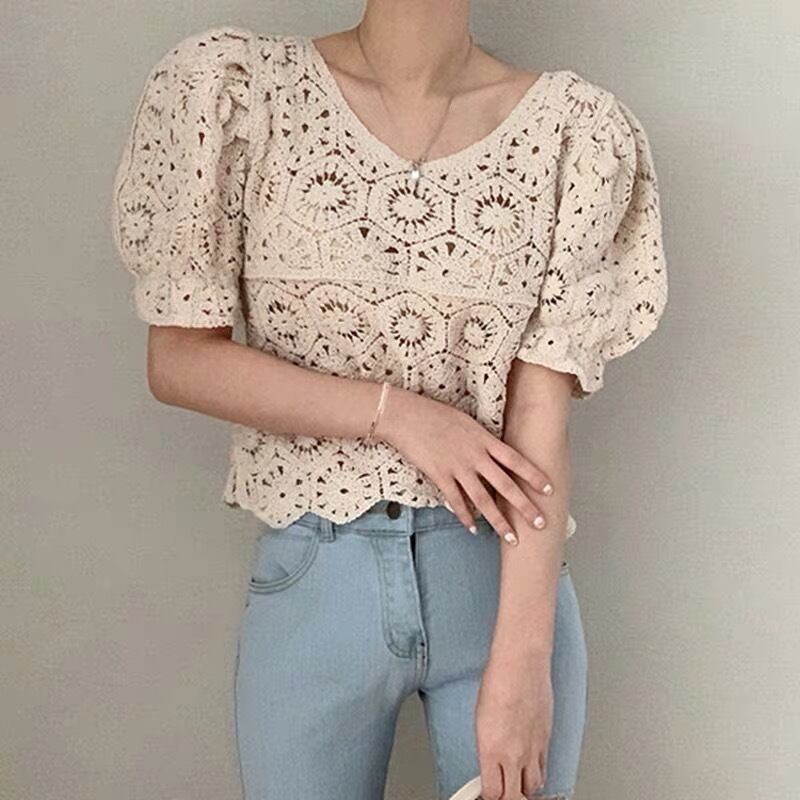 【海外からの取り寄せ】2023新作 レディース トレンド トップス サマーニット クロシェ 透かし編み パフ袖 ベージュ ホワイト 半袖 #[shirt383_12800]【送料込み】【250712】