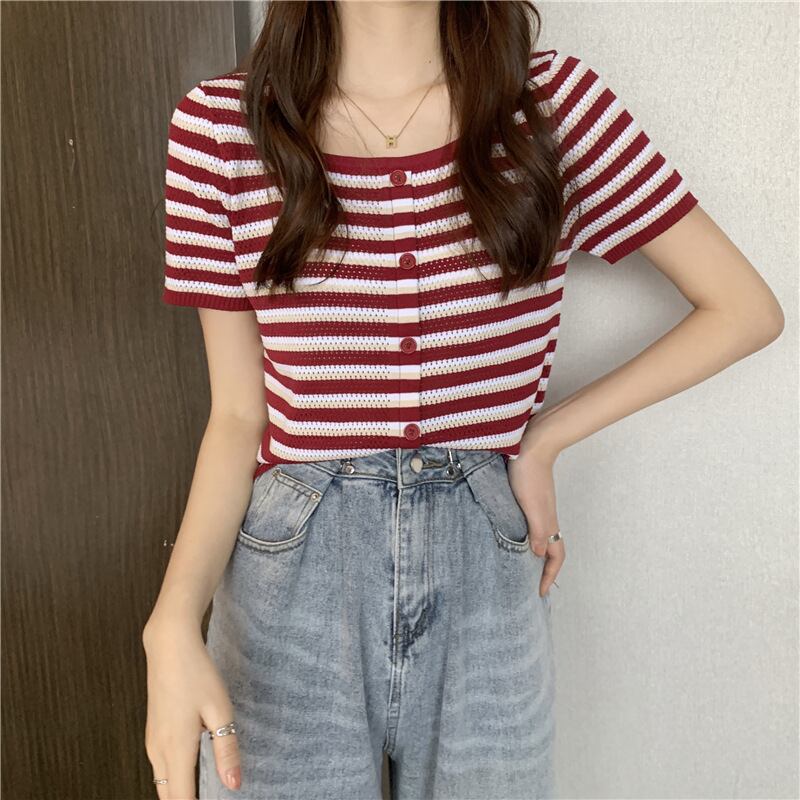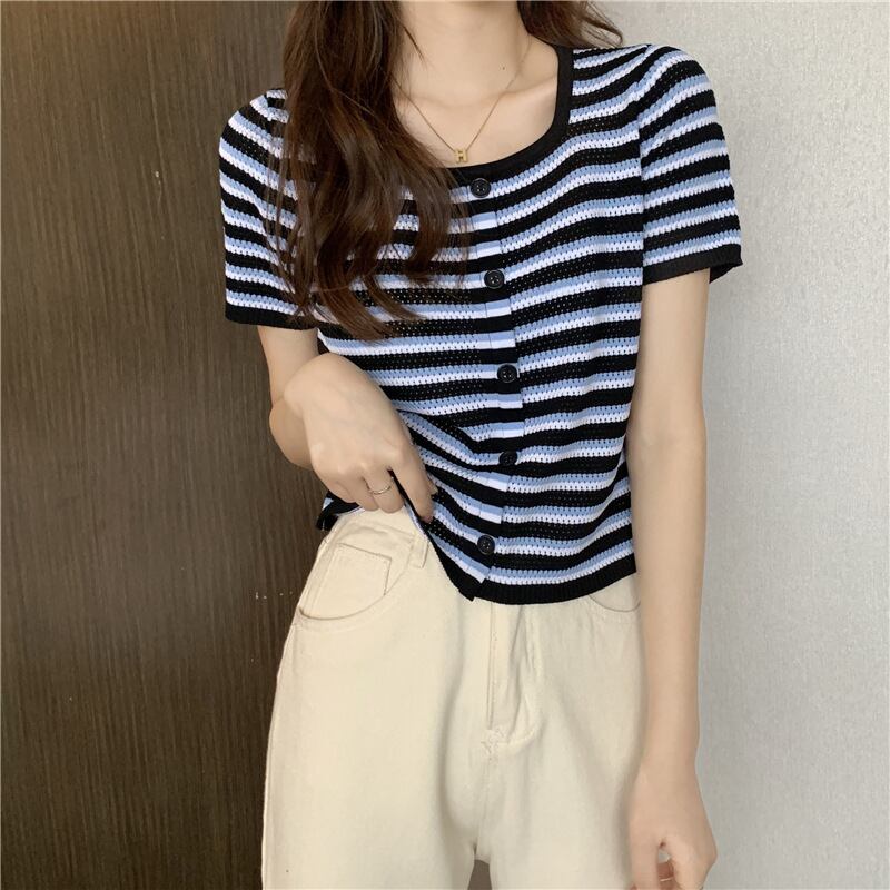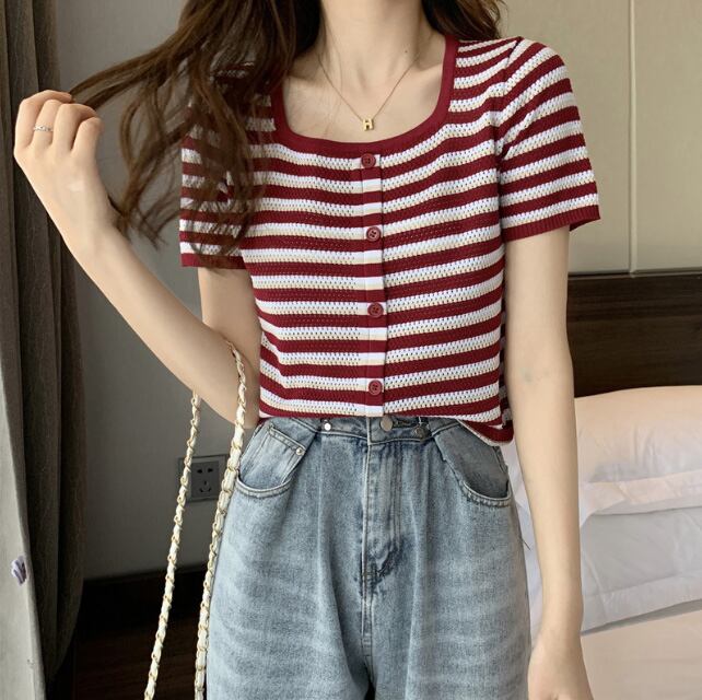 【海外からの取り寄せ】2022新作 レディース トップス カーディガン風 サマーニット風 ストライプ 半袖 通気性 薄手 ショート丈 #[shirt334_11800]【送料込み】【250712】