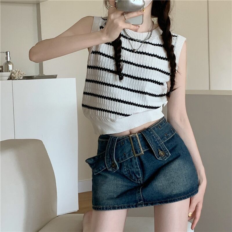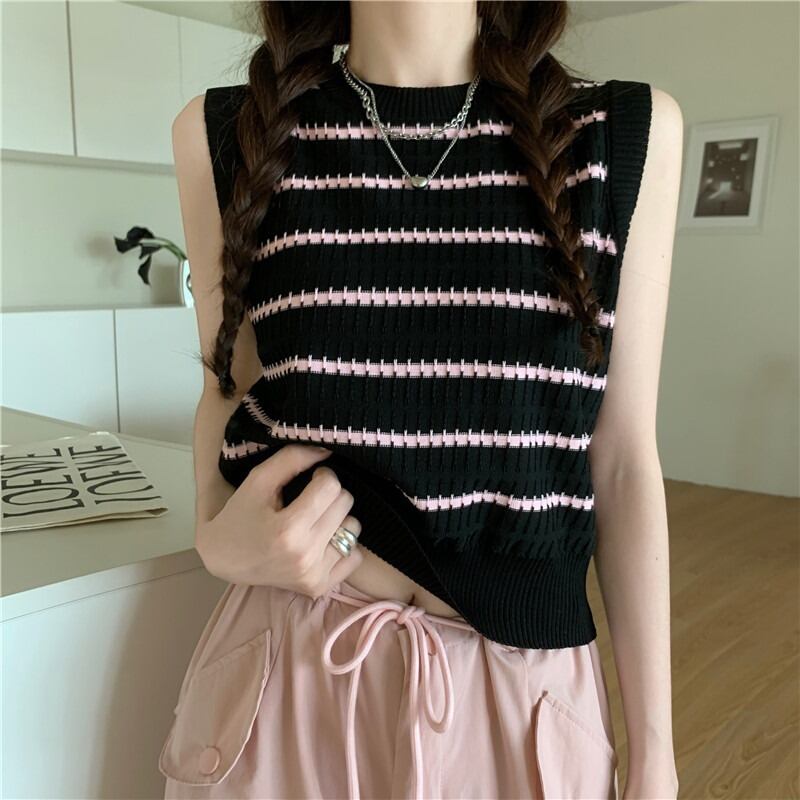 【海外からの取り寄せ】 新作 ボーダー柄 ノースリーブ ニット トップス ソー セーター ショート ショート丈 袖なし #[tops626_8800]【送料込み】【250616】