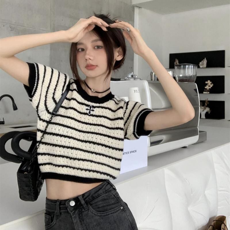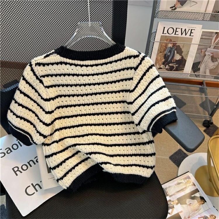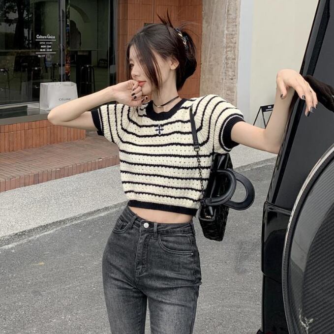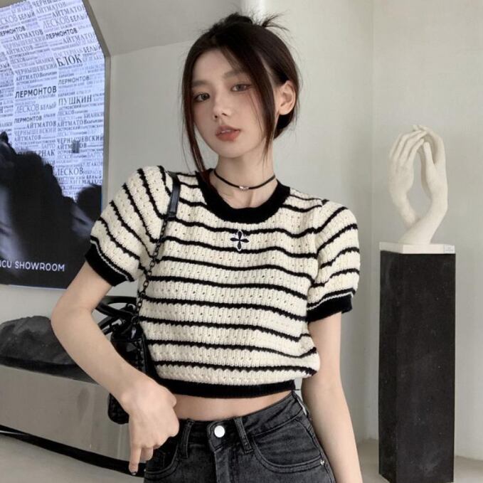 【海外からの取り寄せ】 2025新作 レディース ラウンドネック ボーダ柄 ショート丈 着痩せ 可愛い 半袖ニット #[tops625_9800]【送料込み】【250618】
