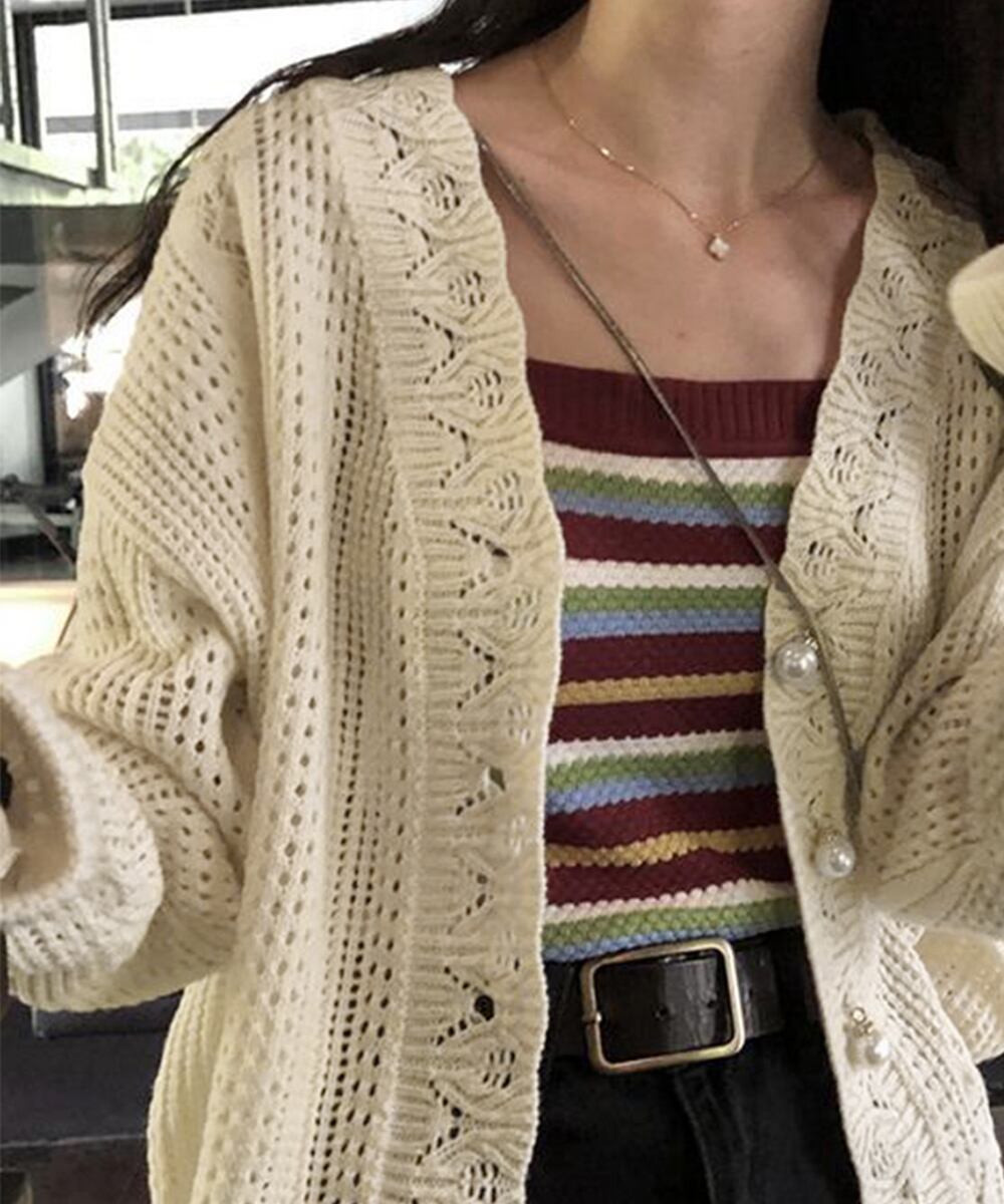 春夏はもちろん、秋にも活躍するゆったりシルエットの透かし編みニットカーディガン。