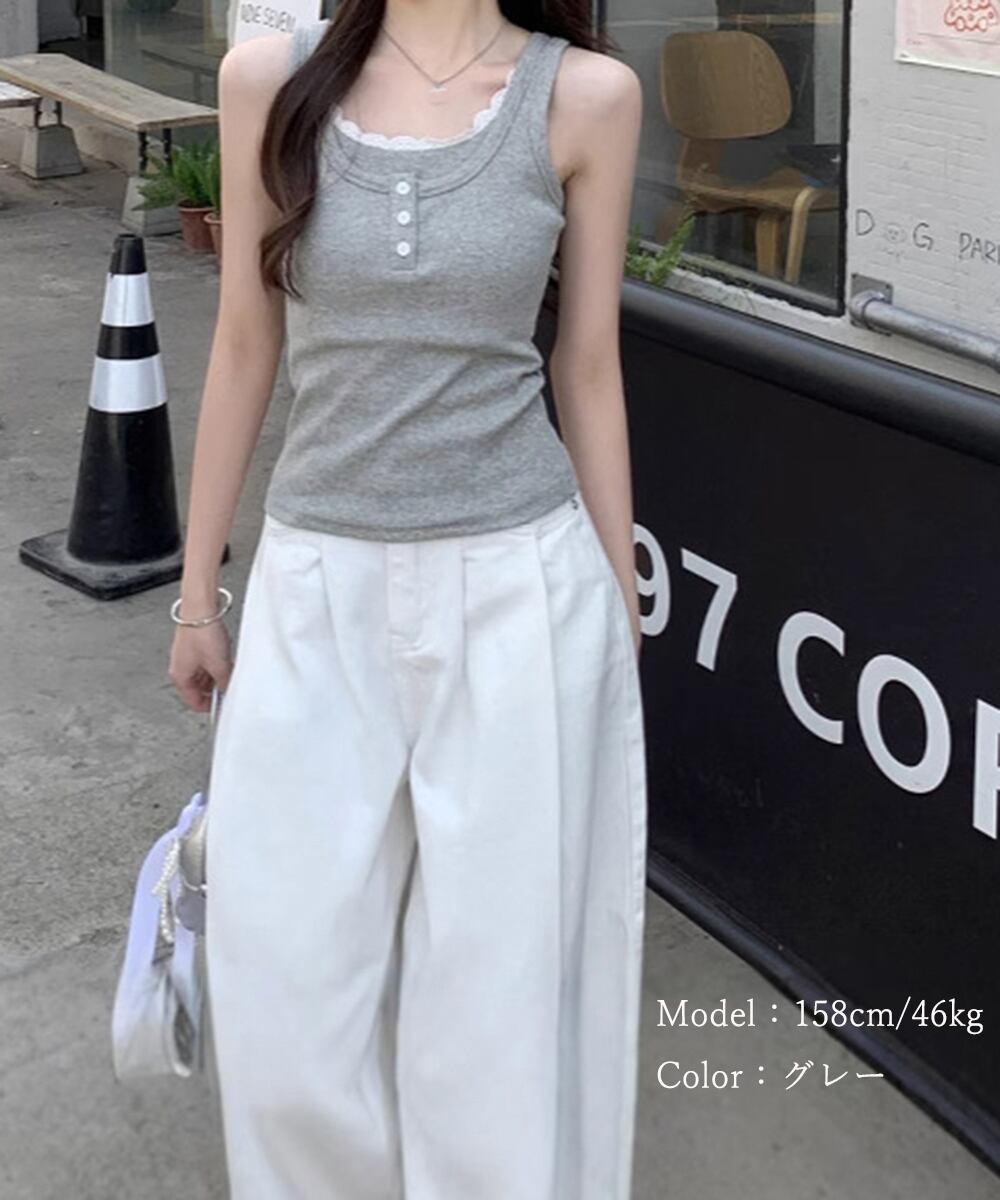 レース付き リブタンクトップ 大人カジュアル ノースリーブ夏服 カットソー 可愛い肌着 フィット 着回しインナートップス