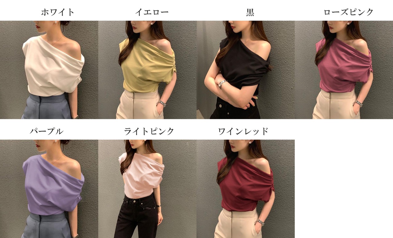 ・トレンドのワンショルデザインはデコルテをきれいに見せてくれます。