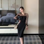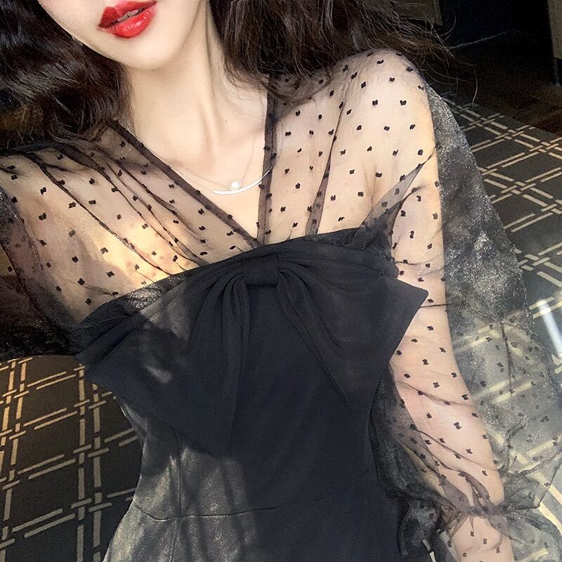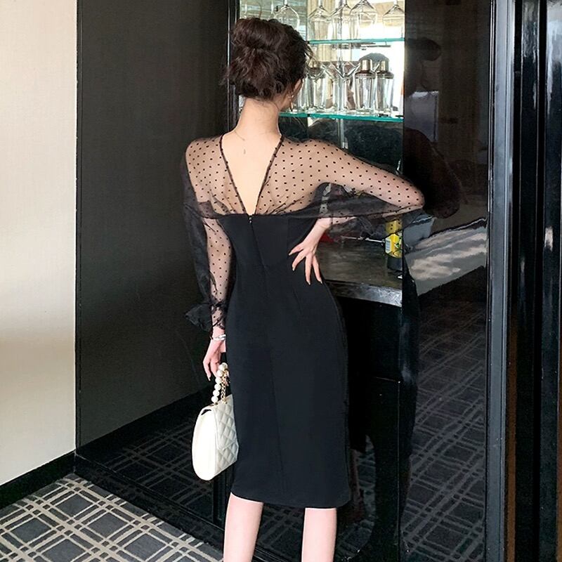 【即日発送】ドット柄袖 レース切り替えワンピース ドレス レディース【 #[3273_18000]】【送料込み】【250907】