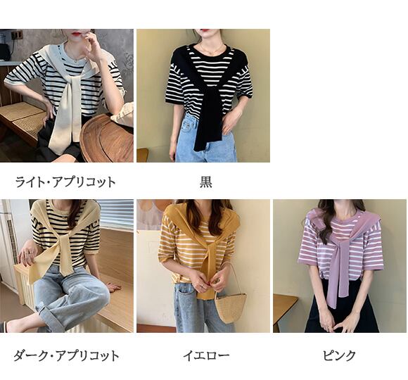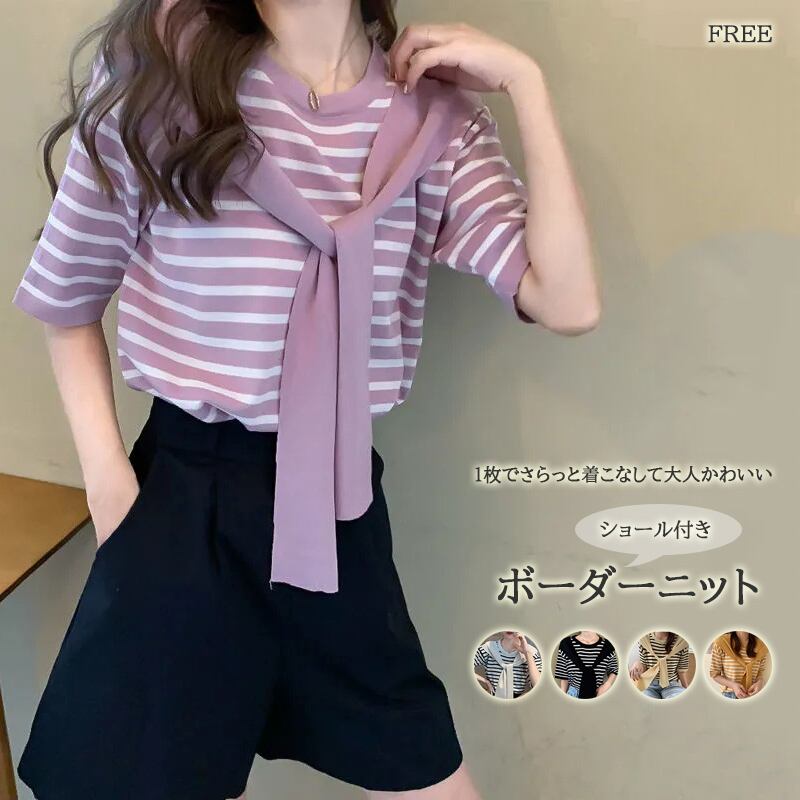 【海外からの取り寄せ】 2025新作 レディース フェイクショール ボーダー半袖ニット トップス カジュアル #[tops586_10800]【送料込み】【250620】