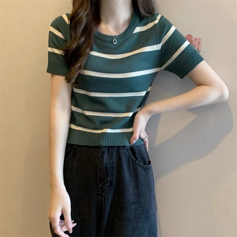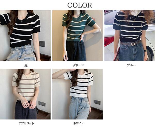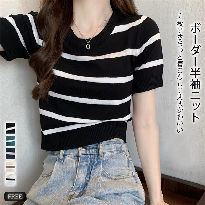 【海外からの取り寄せ】 2025新作 レディース ラウンドネック ボーダー半袖ニット トップス オフィス カジュアル #[tops584_7800]【送料込み】【250620】