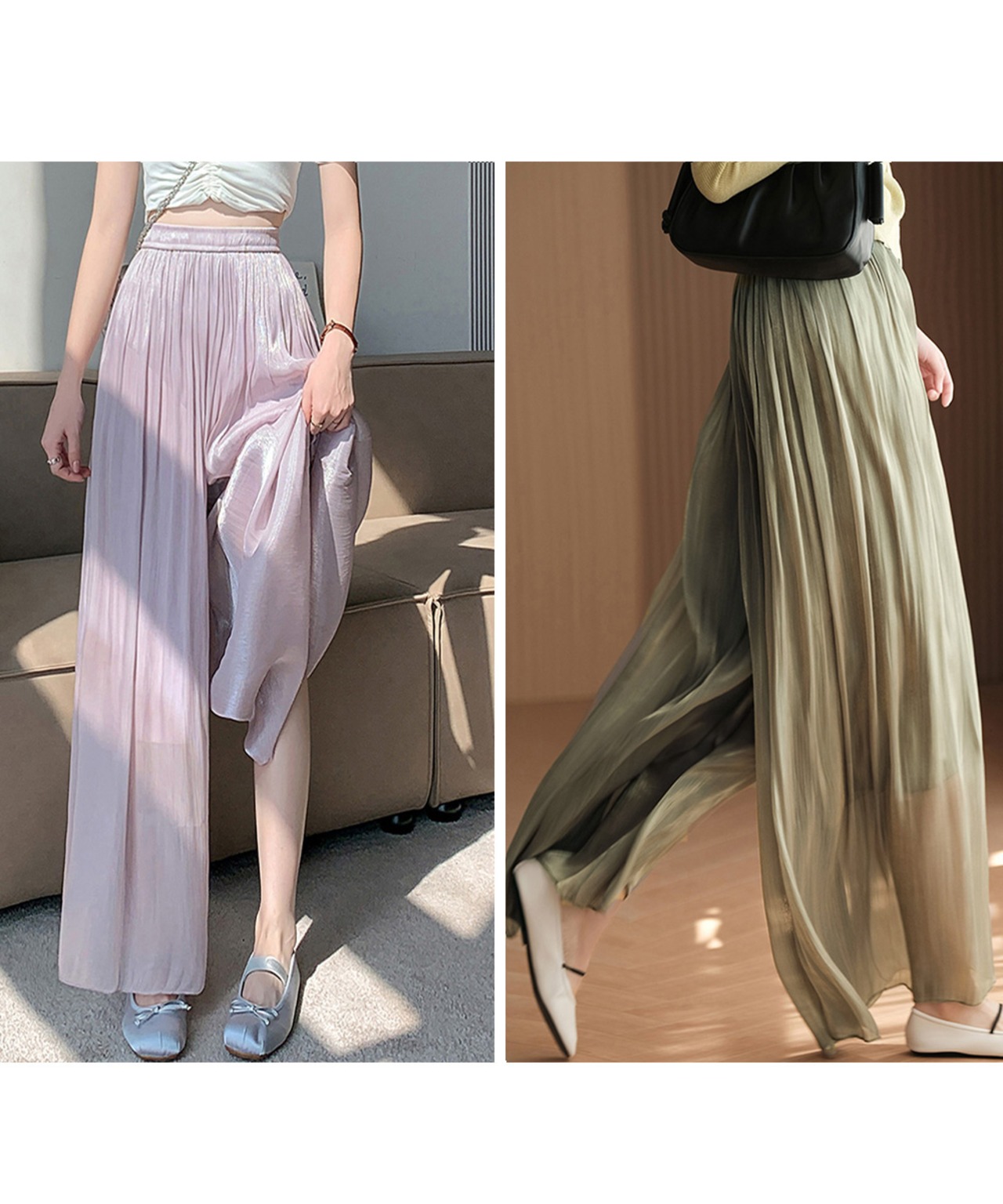 春夏に映える、なめらかな光沢感が魅力のシアーワイドパンツ。