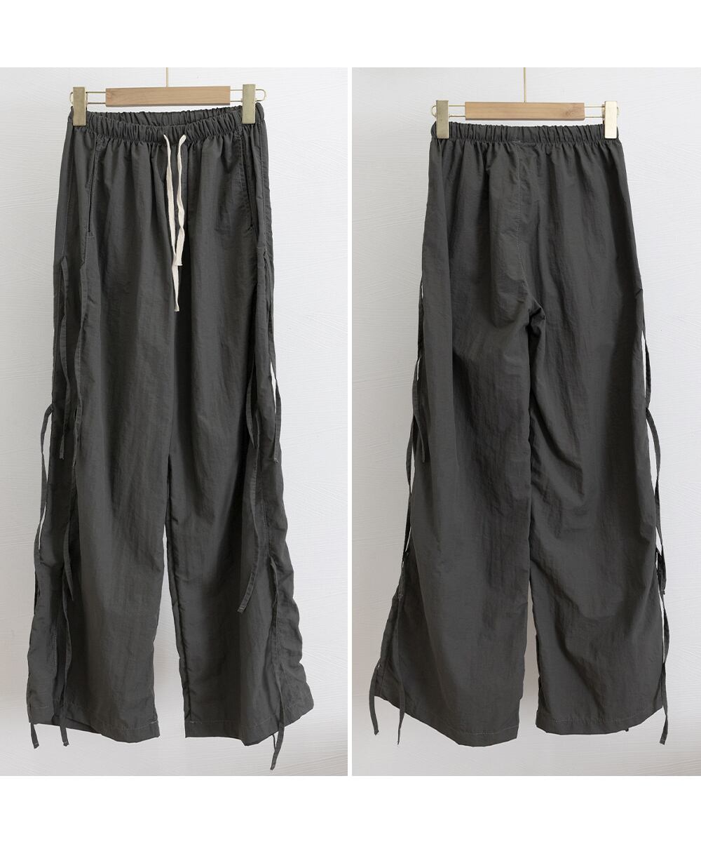 サイドリボンがアクセントになった、ラフなムード漂うカーゴ風ワイドパンツ。