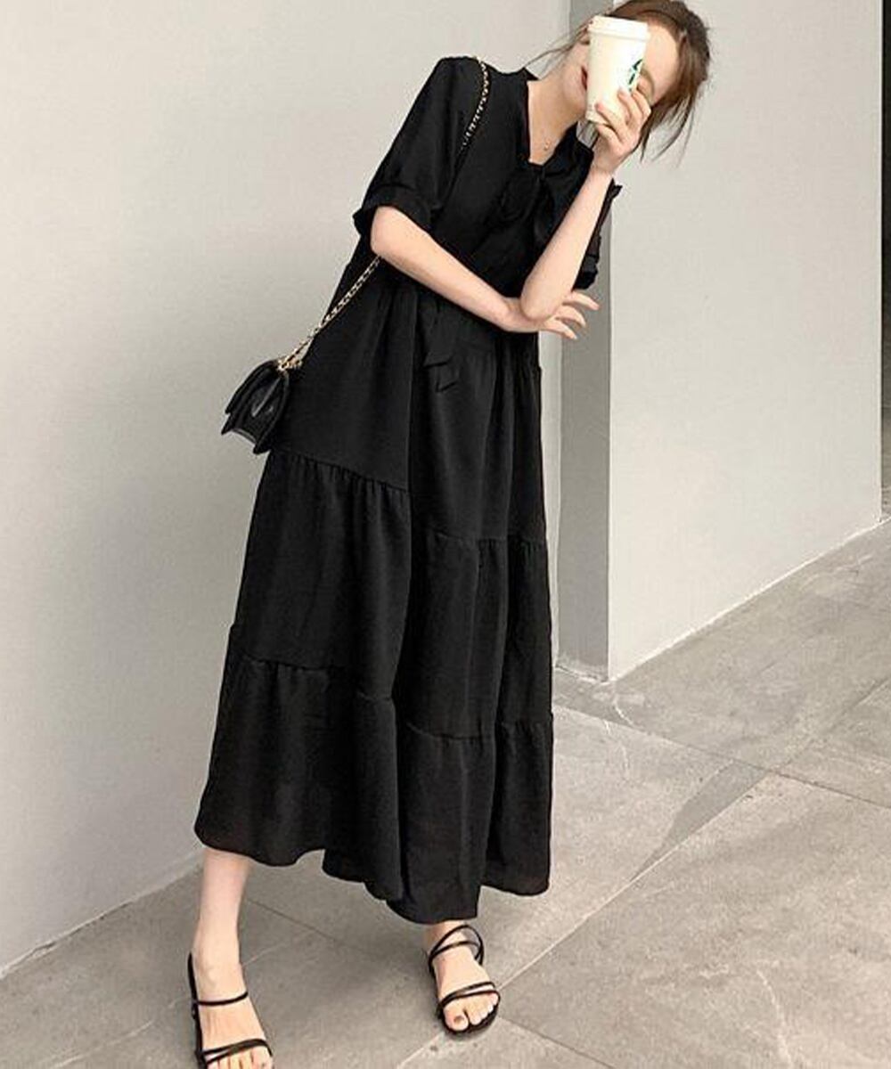 【日本倉庫からの発送】 リボンタイ ティアードワンピースミモレ丈 #[83KANGK-001_25300]【送料込み】【250702】