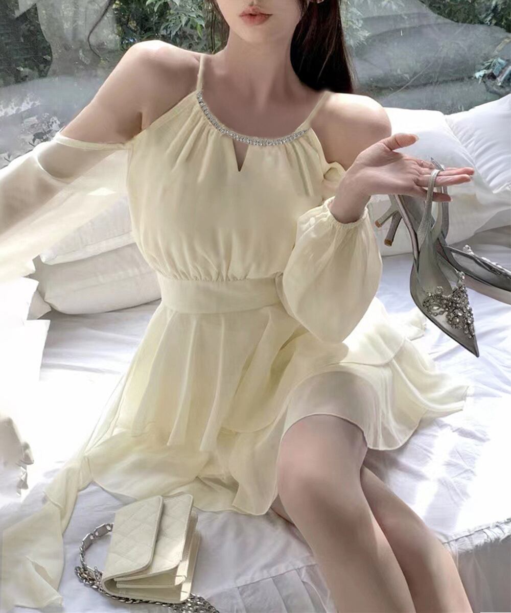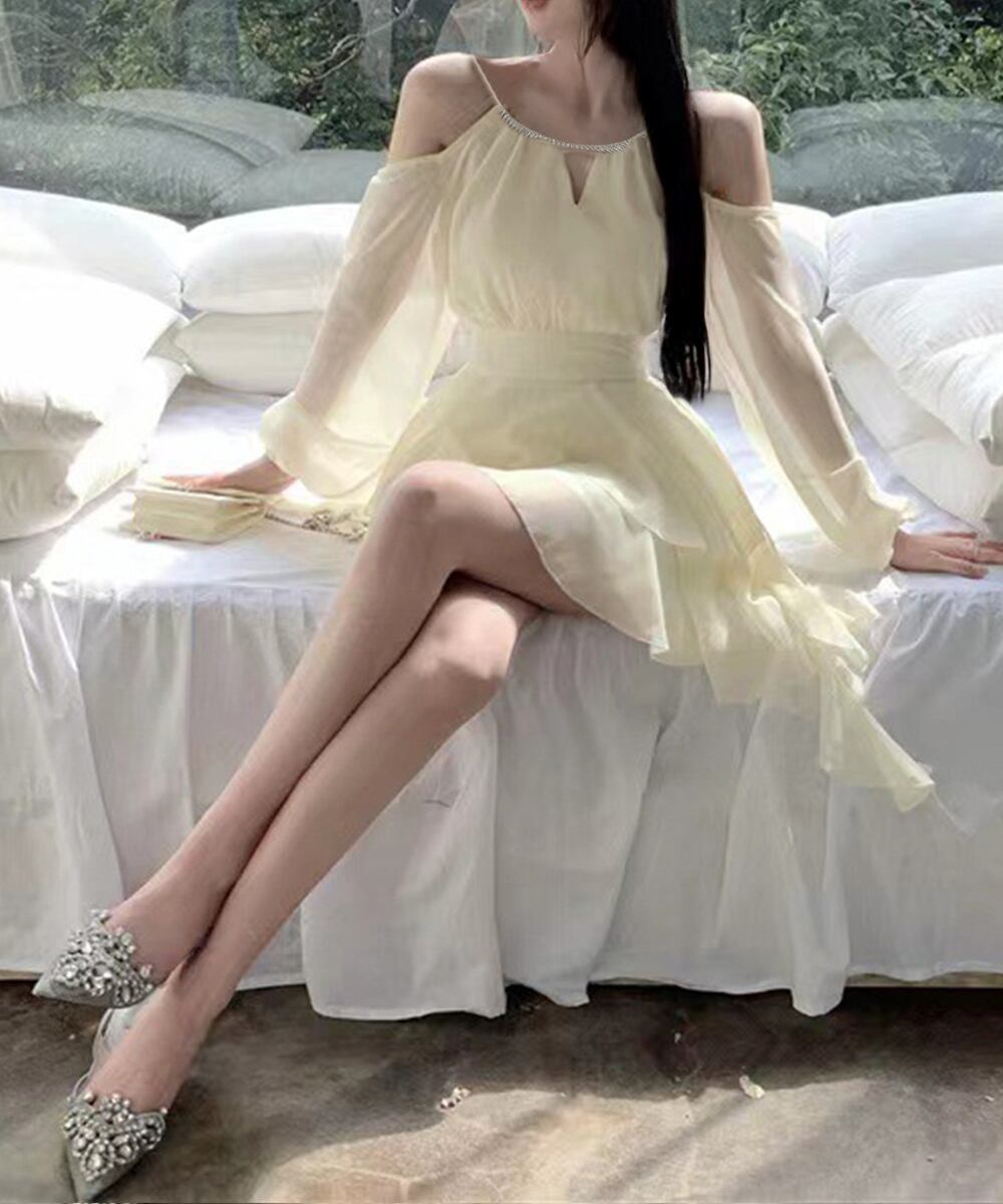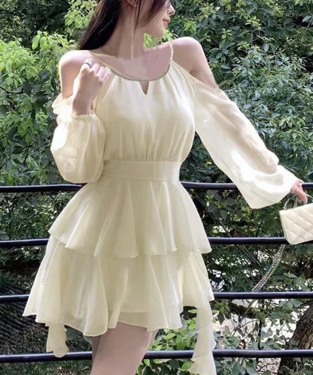 ふわっと広がるシフォン素材とオフショルダーのデザインがフェアリー感をアップ