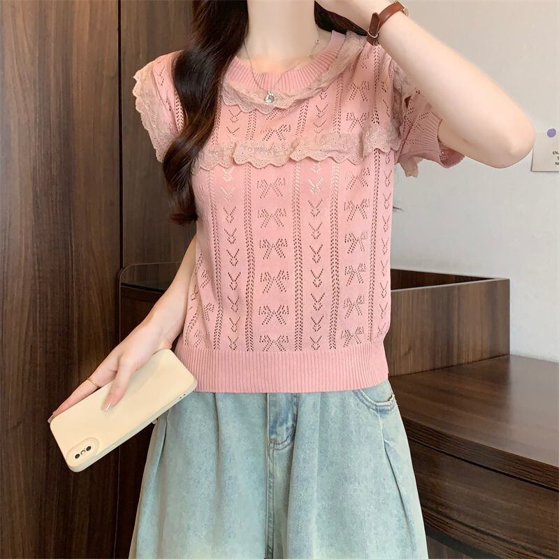 【海外からの取り寄せ】 2025新作 レディース 透かし編み ニットトップス 可愛い リボン柄 フリル #[tops639_12800]【送料込み】【250712】
