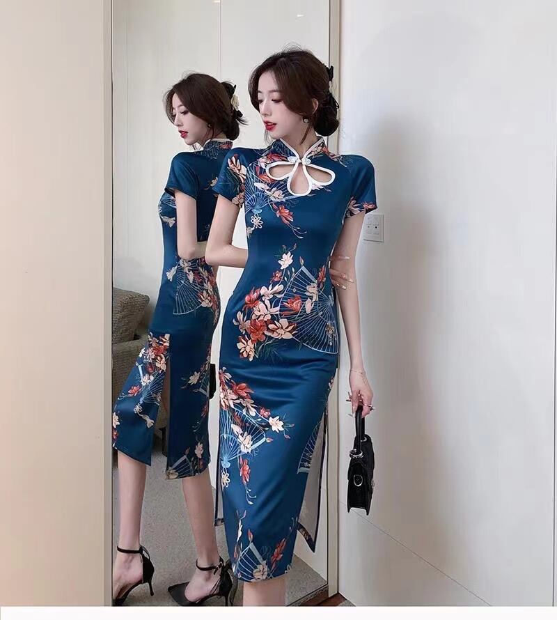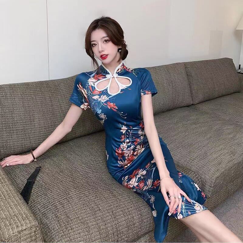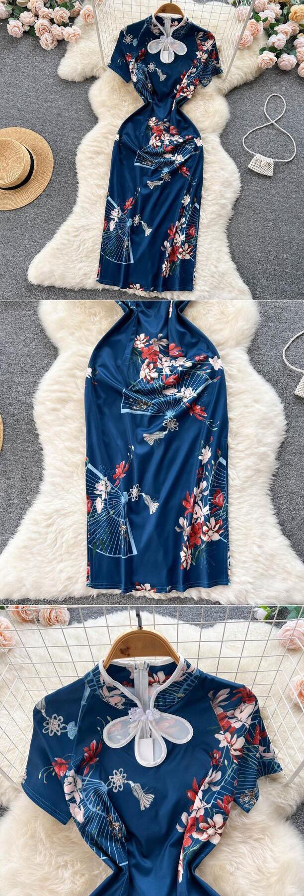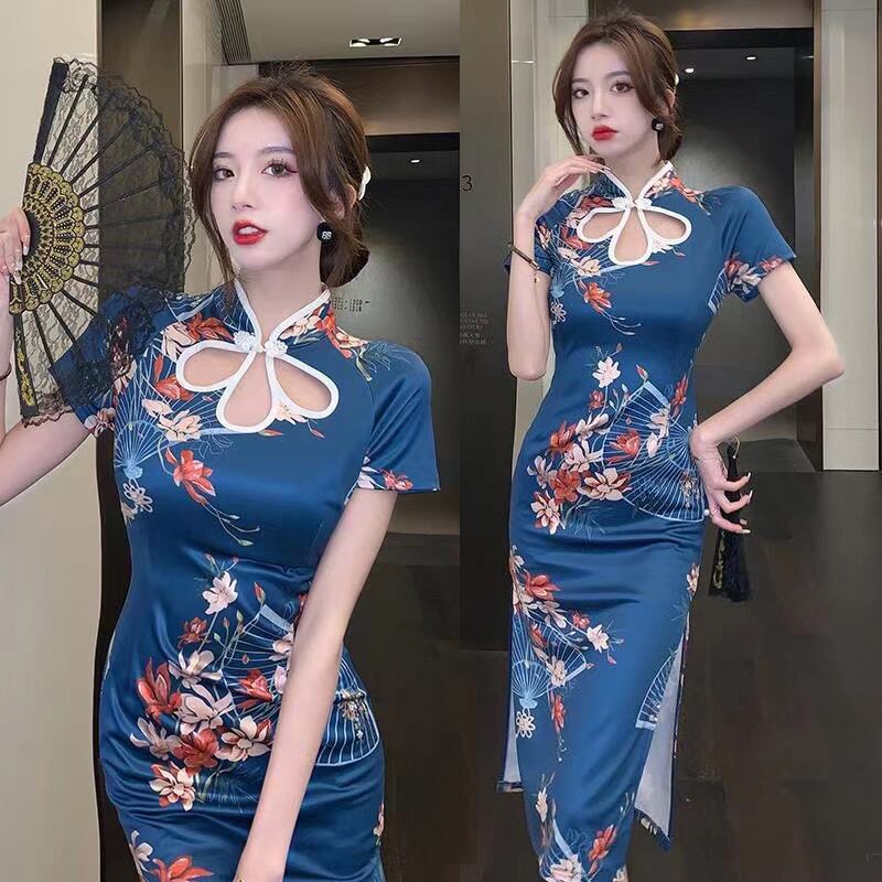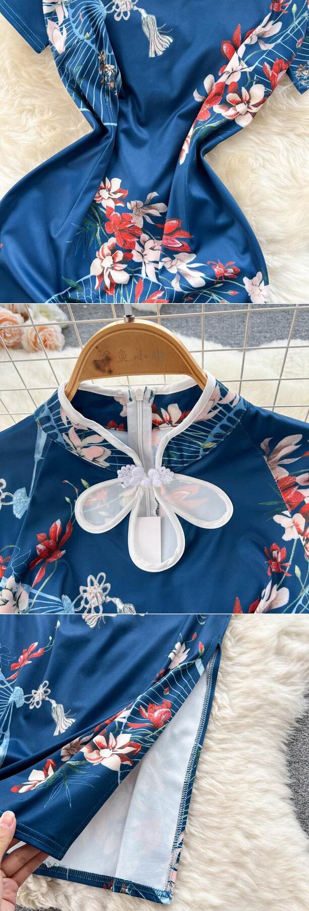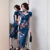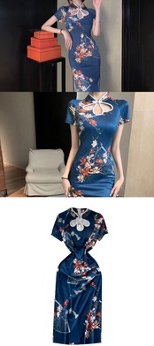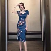ネックのデザインが特徴的なセクシー紺地の花柄チャイナドレス、