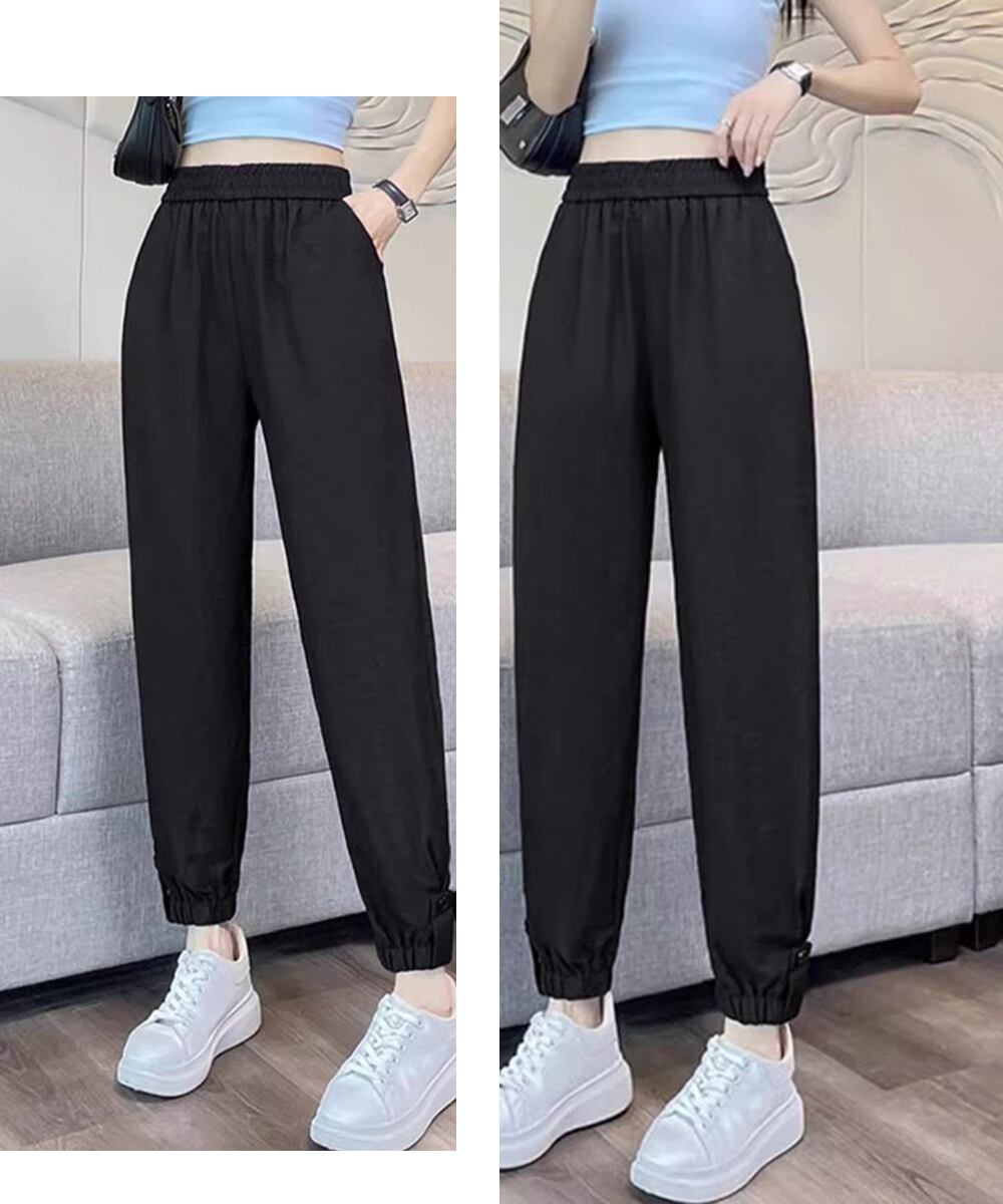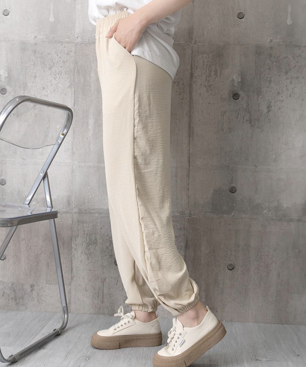 イージーパンツ 韓国風 無地 レディースボトムス 九分丈 ゆったり 薄手 ポケット付き 着回し 裾ゴムパンツ カジュアル