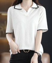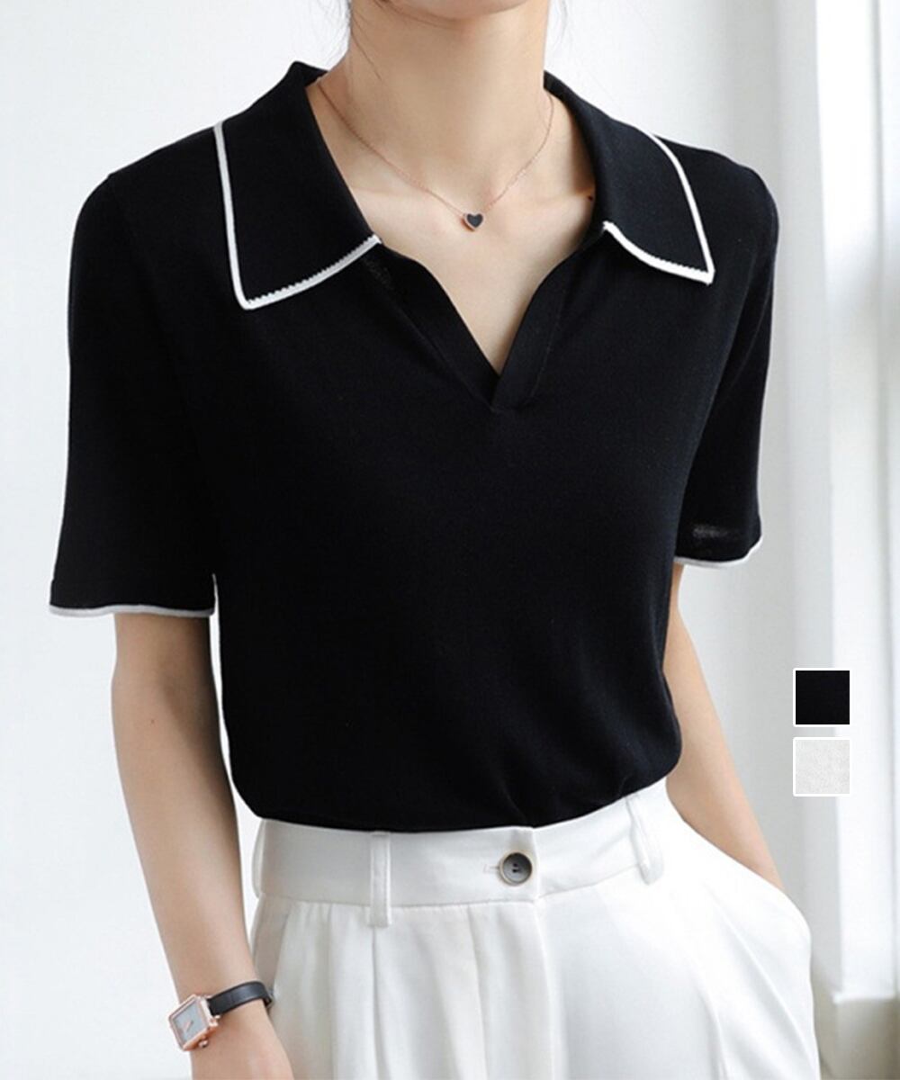 ポロ襟トップス 上品ニットTシャツ シンプル 冷感タッチ サマーニット オフィスカジュアル服 着回し Vネックニットソー