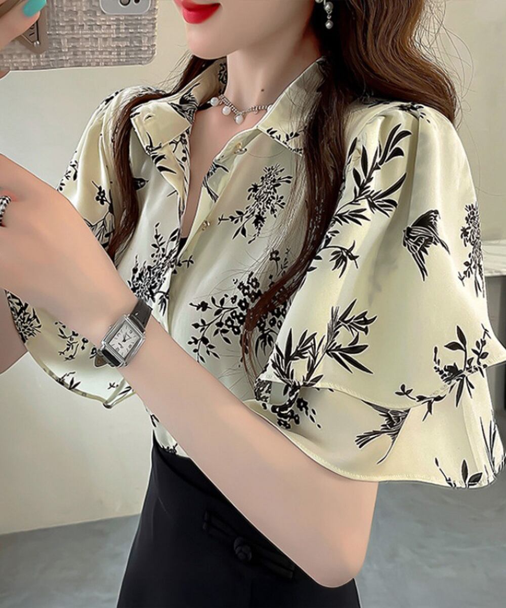 二重仕立てのフレアスリーブが印象的な総柄ブラウス。
