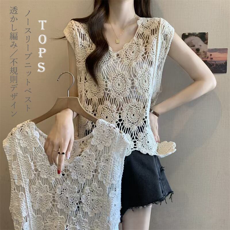 【海外からの取り寄せ】2025年新作 花柄 ジレ 刺繍 レース ベスト 不規則Vネック ノースリーブニットベスト透かし編み不規則 #[tops646_14800]【送料込み】【250706】