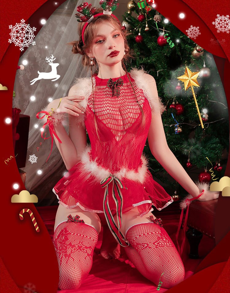 トナカイカチューシャ、腕飾り、レオタード、スカート、ストッキング