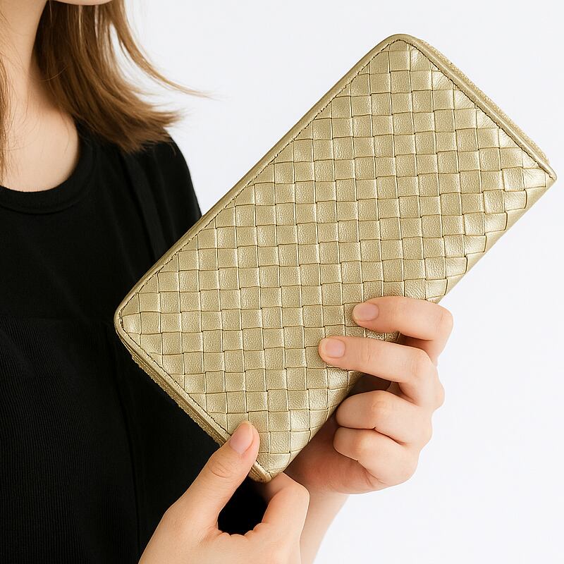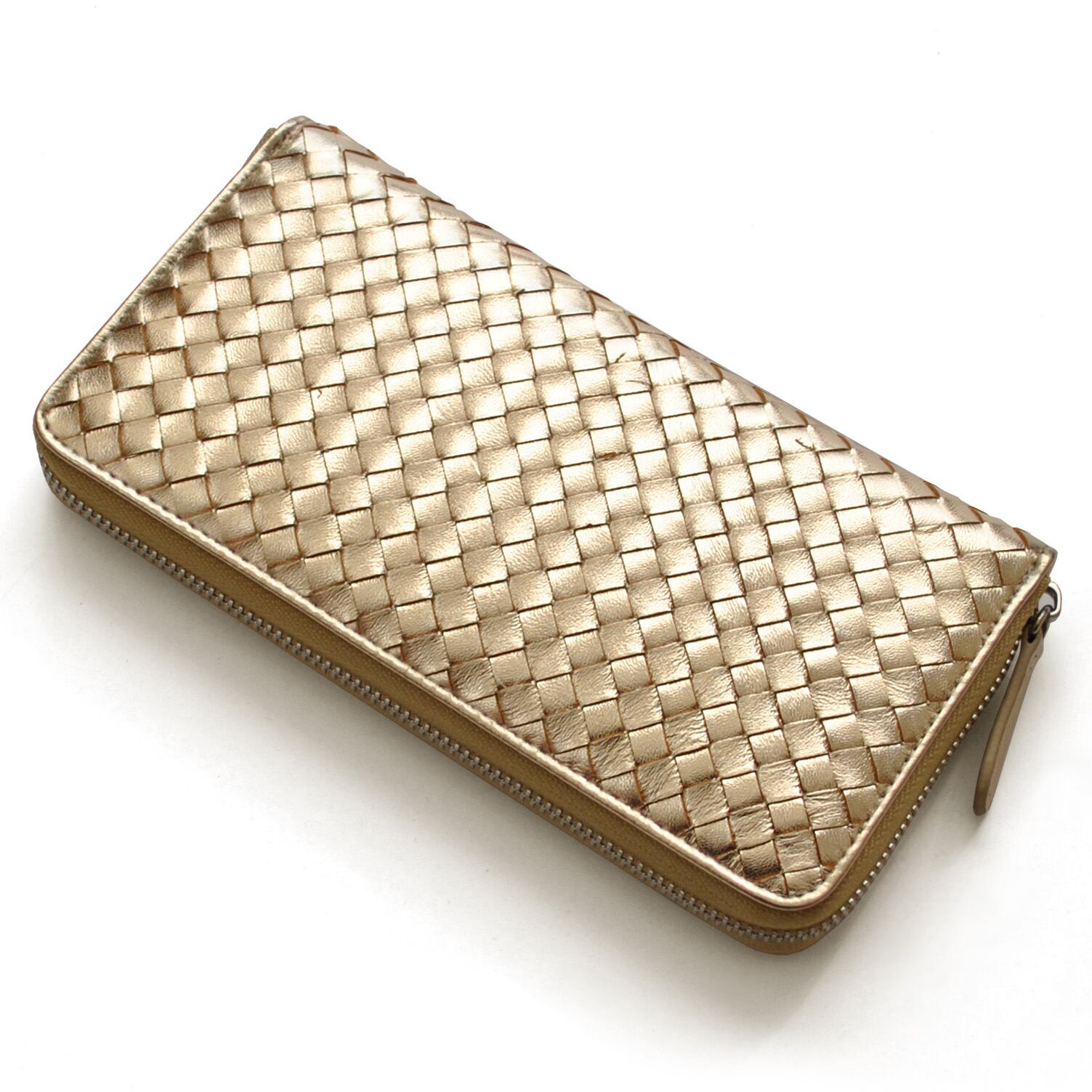 メッシュシープスキン革ラウンドファスナー長財布 #[E-031M-GD_40000]◆ゴールドカラー羊革編み込み婦人財布◆【送料込み】【251103】