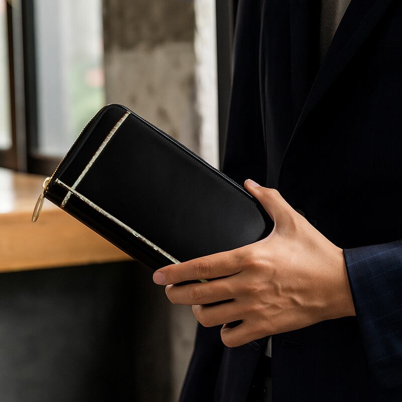 黒×金の開運最強カラーに加え、富と繁栄の象徴である蛇革ラインの相乗効果!