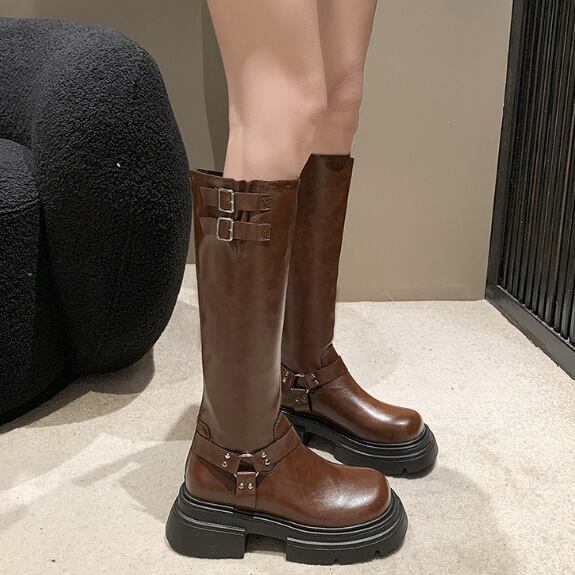 【海外からの取り寄せ】2023新作 レディース 靴 ブーツ ロング ラウンドトゥ レザー調 厚底 脚長 スタイルアップ 黒 ブラウン #[boots268_29800]【送料込み】【250915】