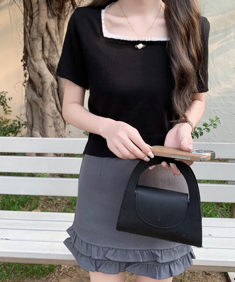 フェミニンな雰囲気漂う、レース付きスクエアネックニットトップス。