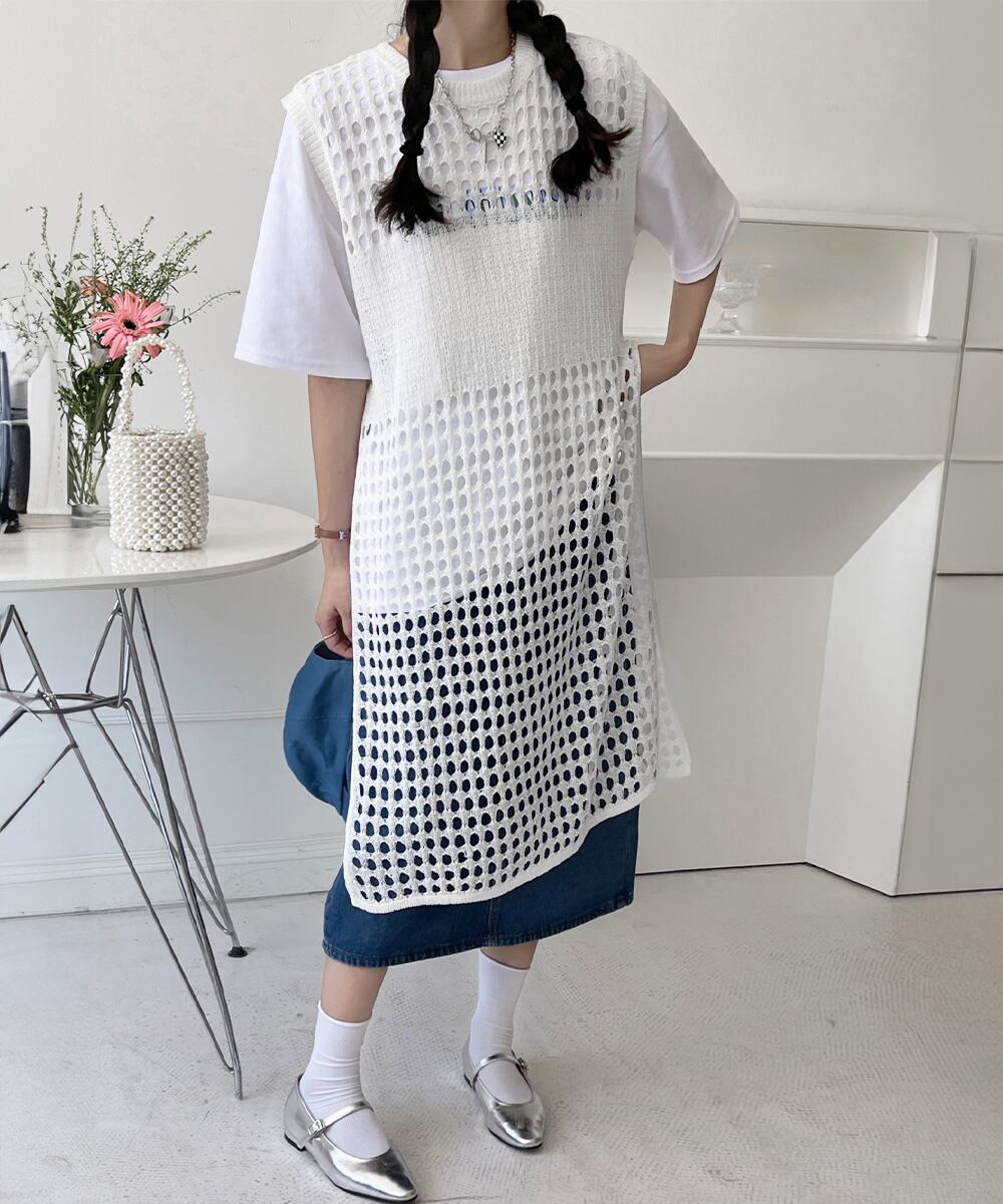 夏らしい抜け感を演出する透かし編みデザインのロングベスト。