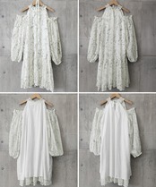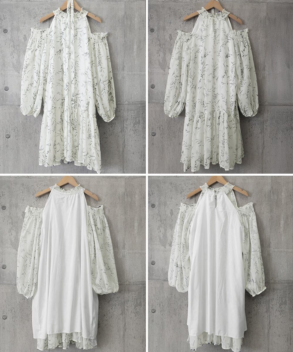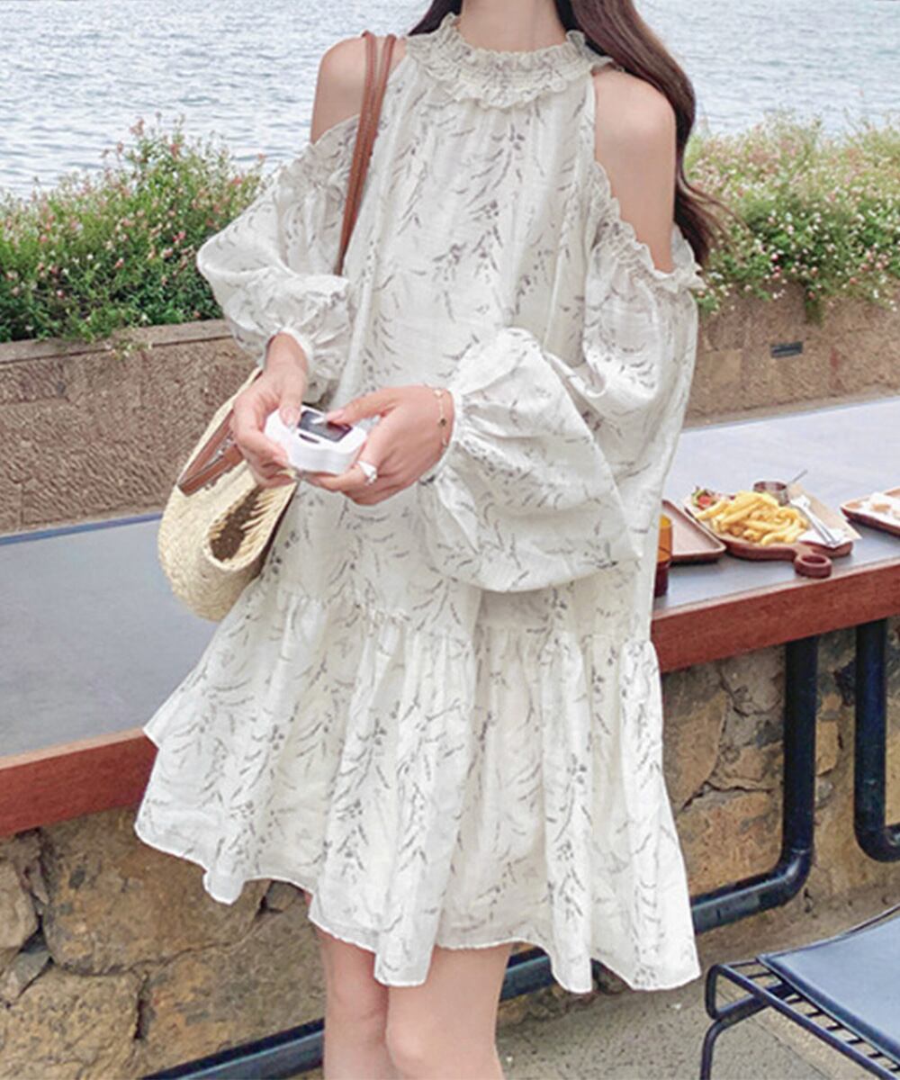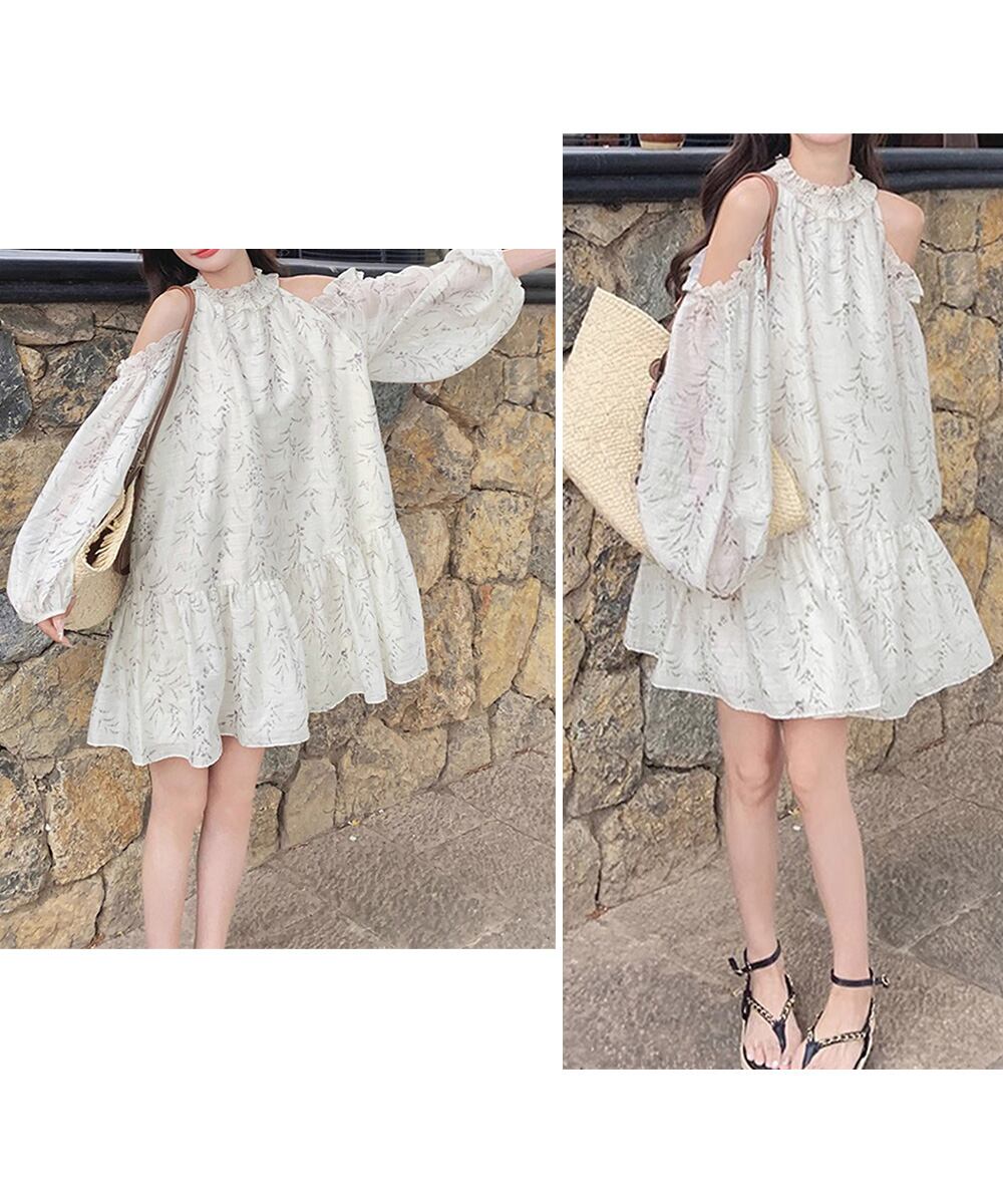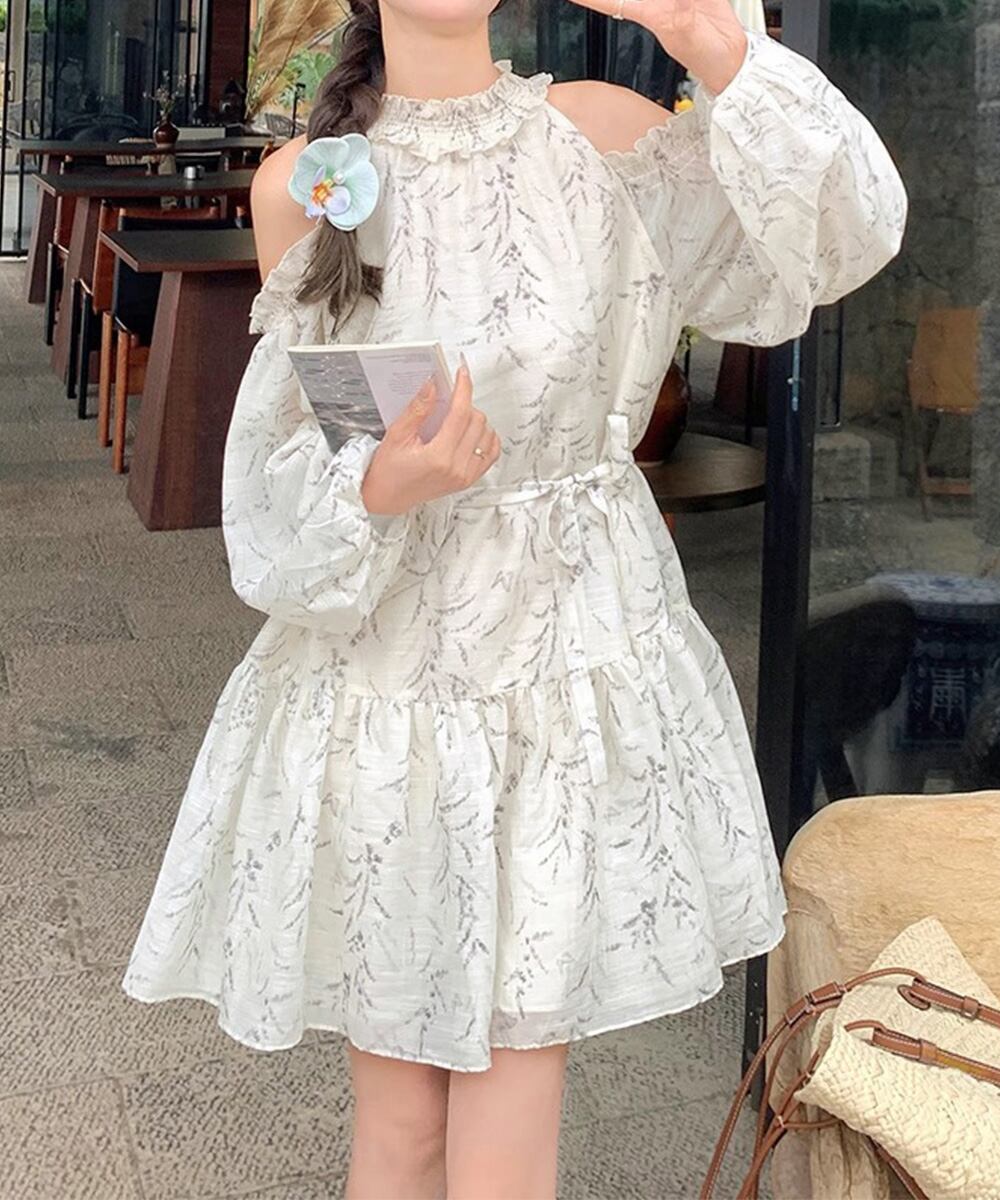 肩を大胆に見せるオフショルダーデザインの花柄ミニワンピース。
