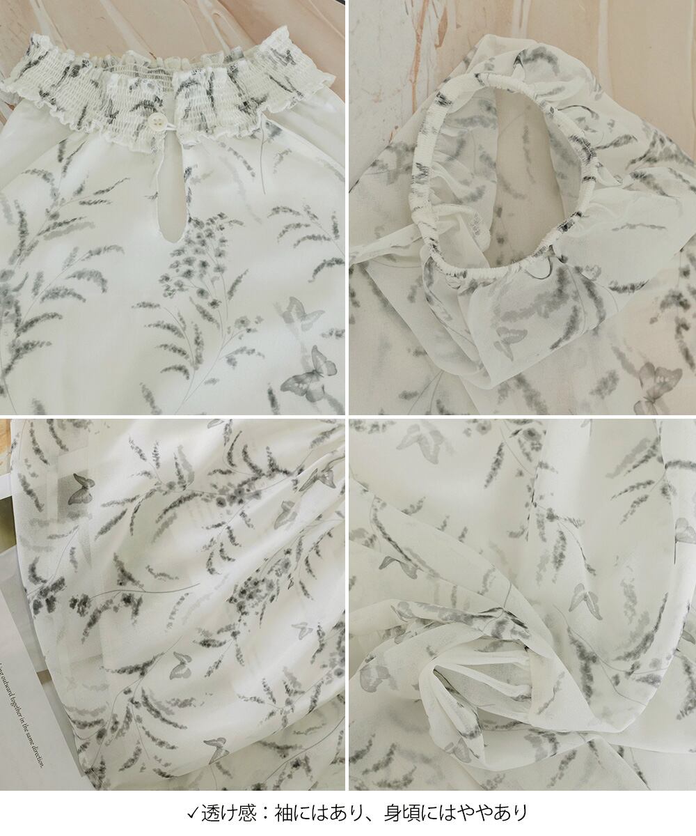 ランタンスリーブとフリルネックがフェミニンな印象を引き立てる。