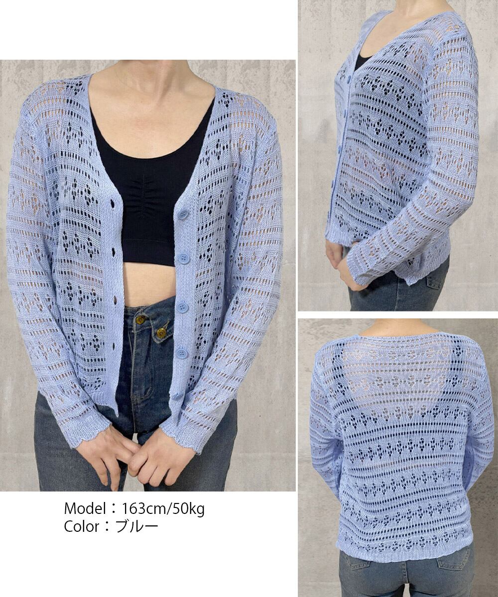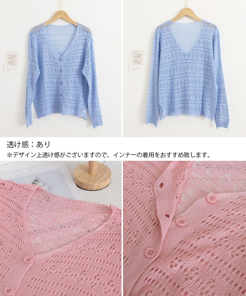 レディース 透かし彫りニットカーディガン 大人可愛い 透け感長袖トップス Vネックサマーニット 紫外線対策 冷房対策上着