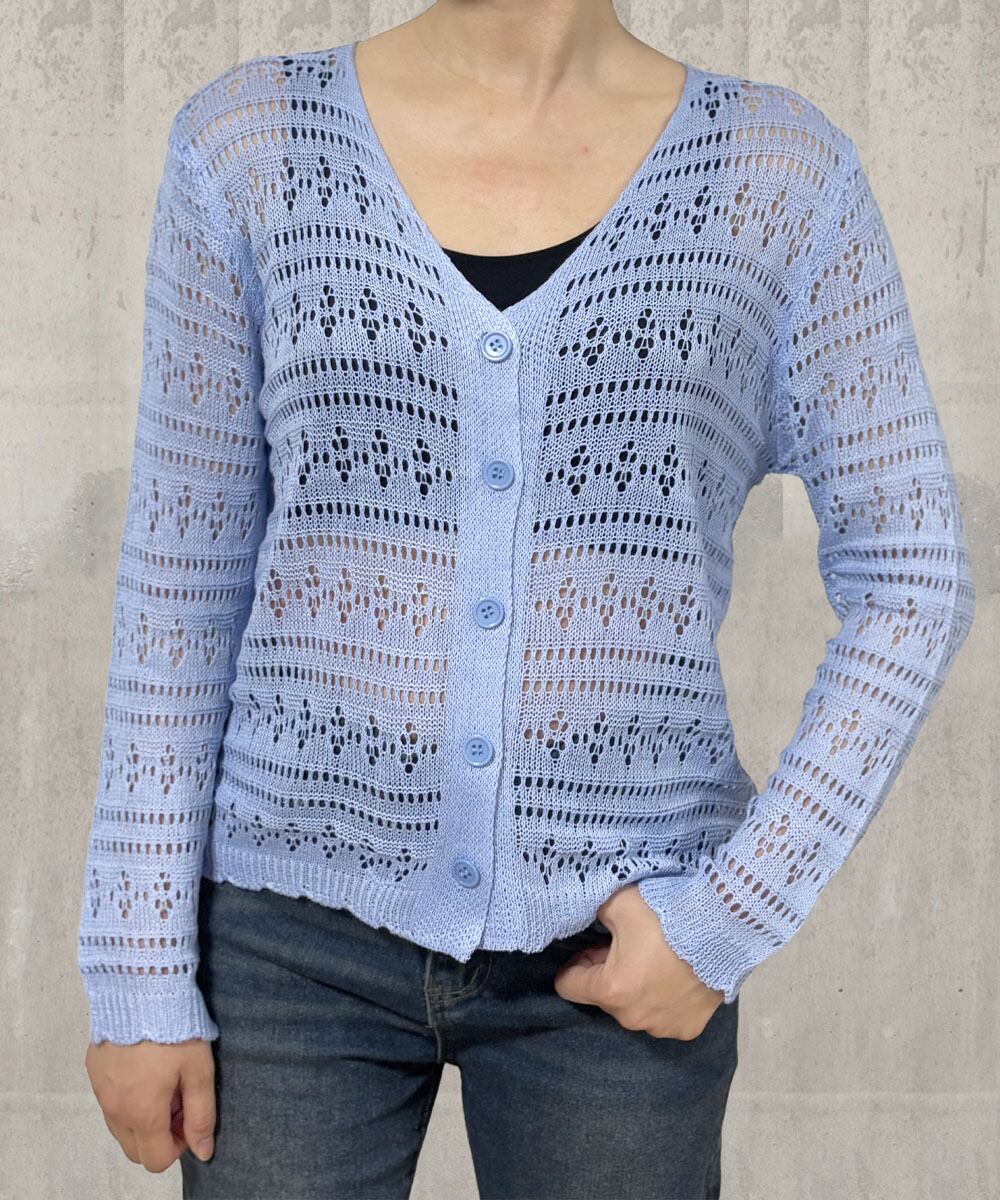 透かし編みのやさしい表情が魅力の、シンプルなVネックカーディガン。