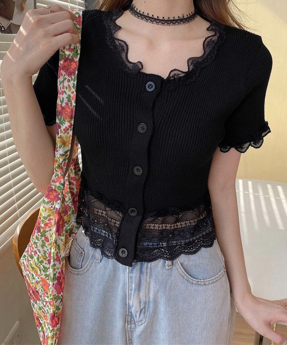 ガーリーなムード漂う、レース付きリブカーディガン。