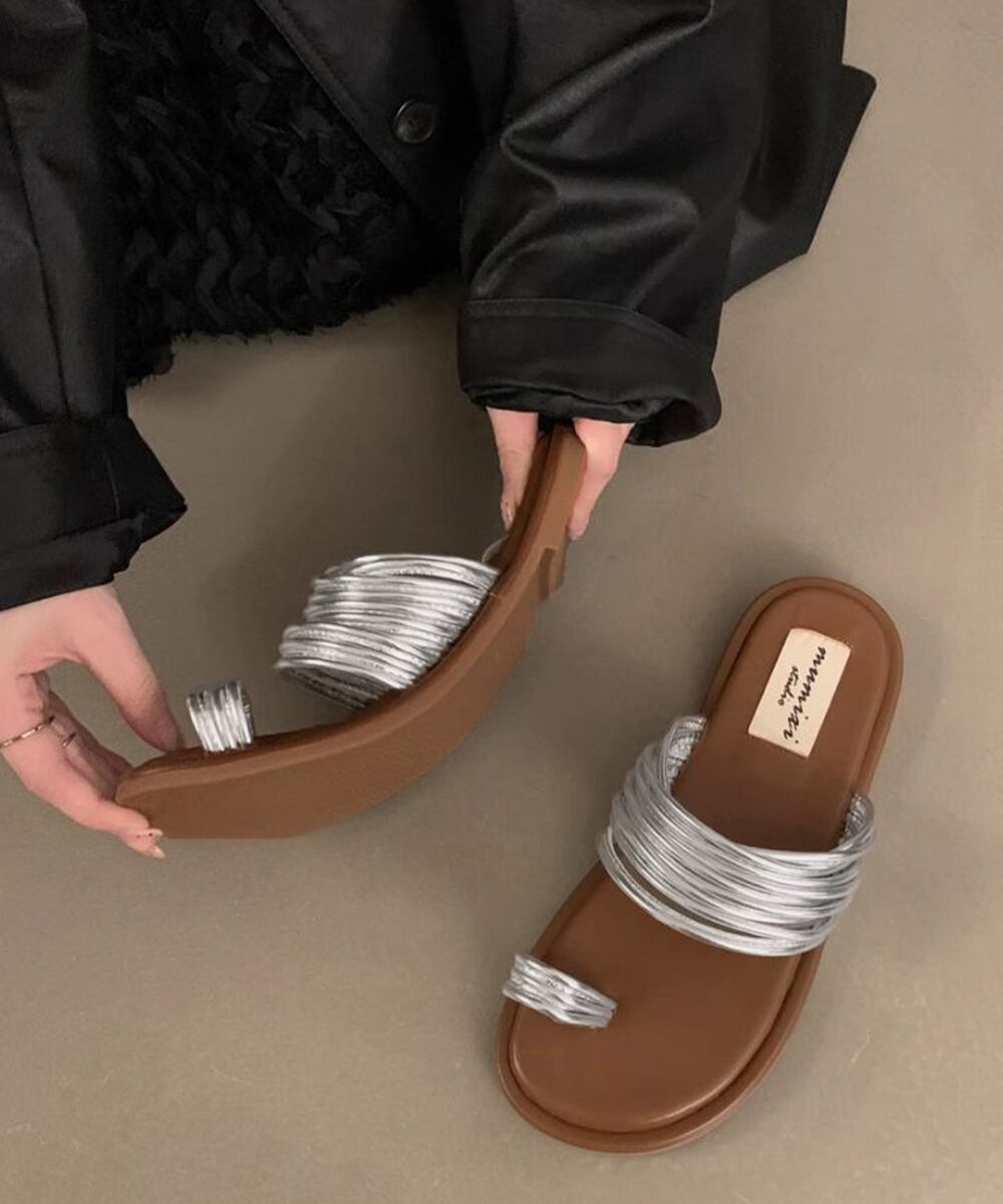 モードな雰囲気漂うメタリックストラップのトングサンダル。