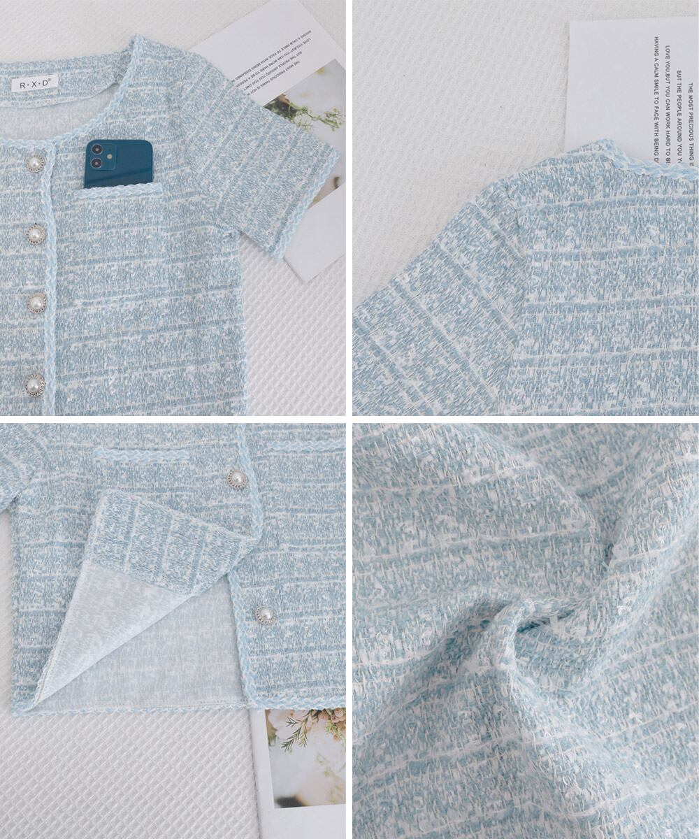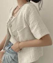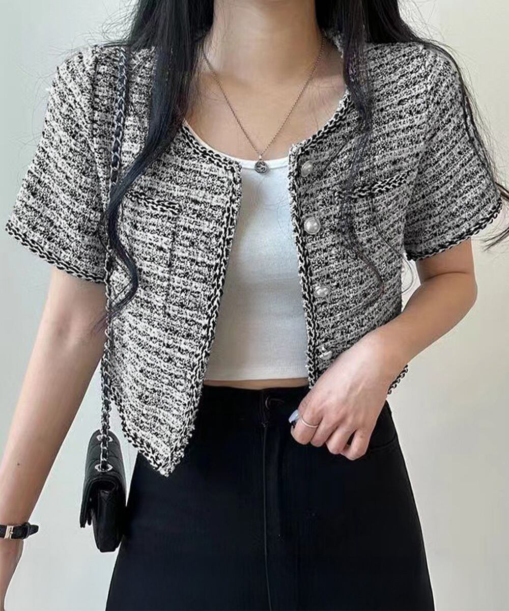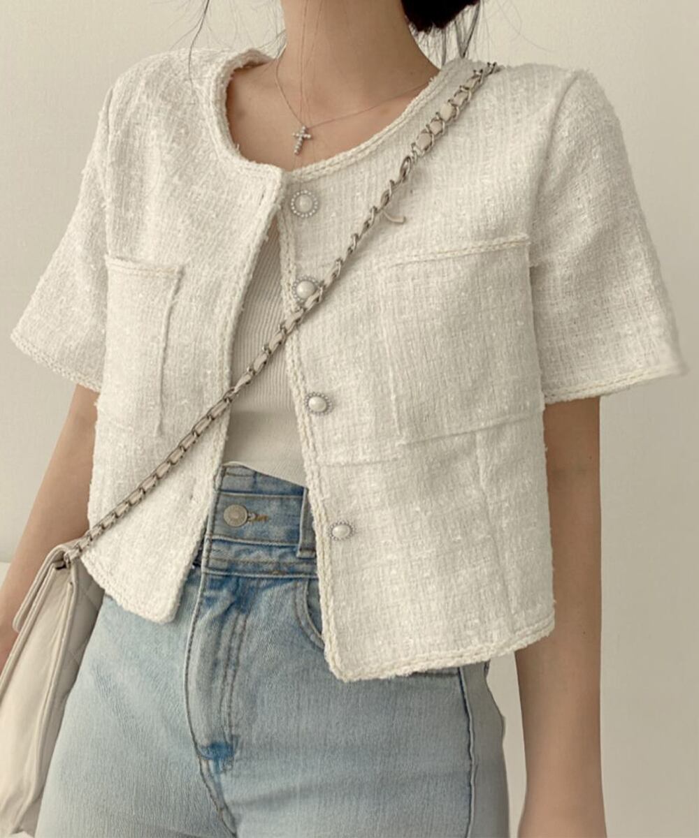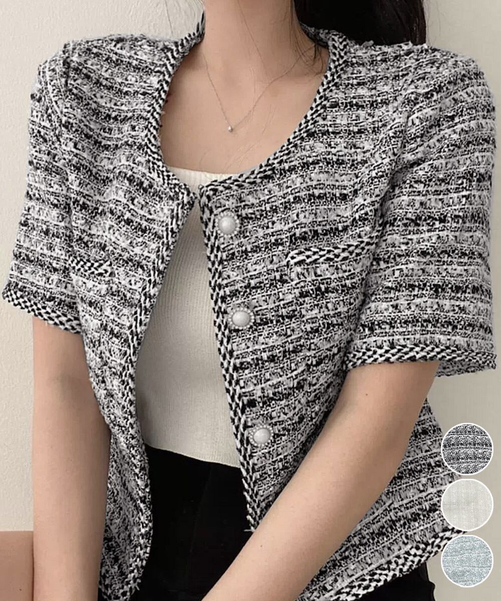 立体感のあるツイード風の素材に、ほんのりラメを織り交ぜた華やかなショートジャケット。