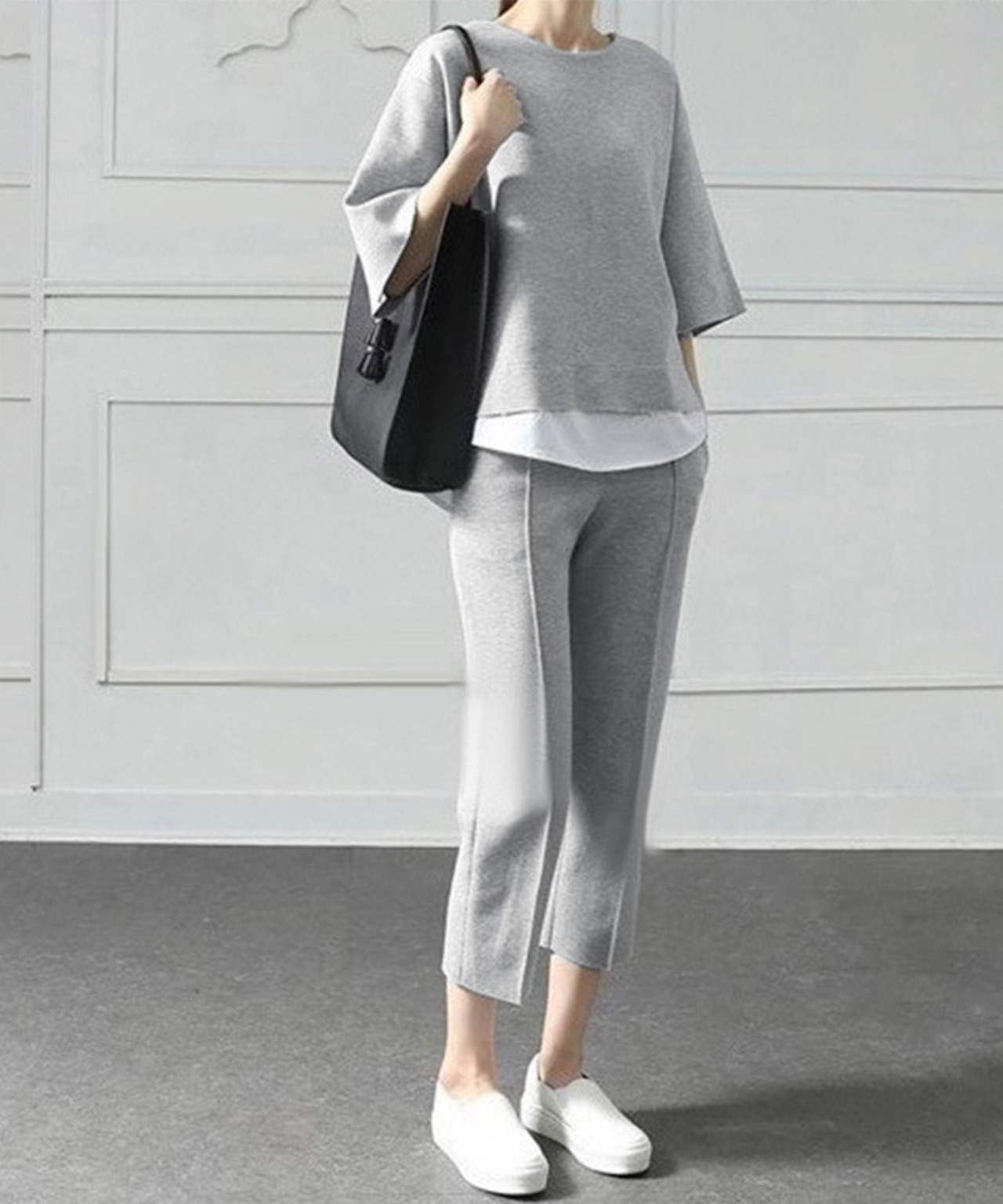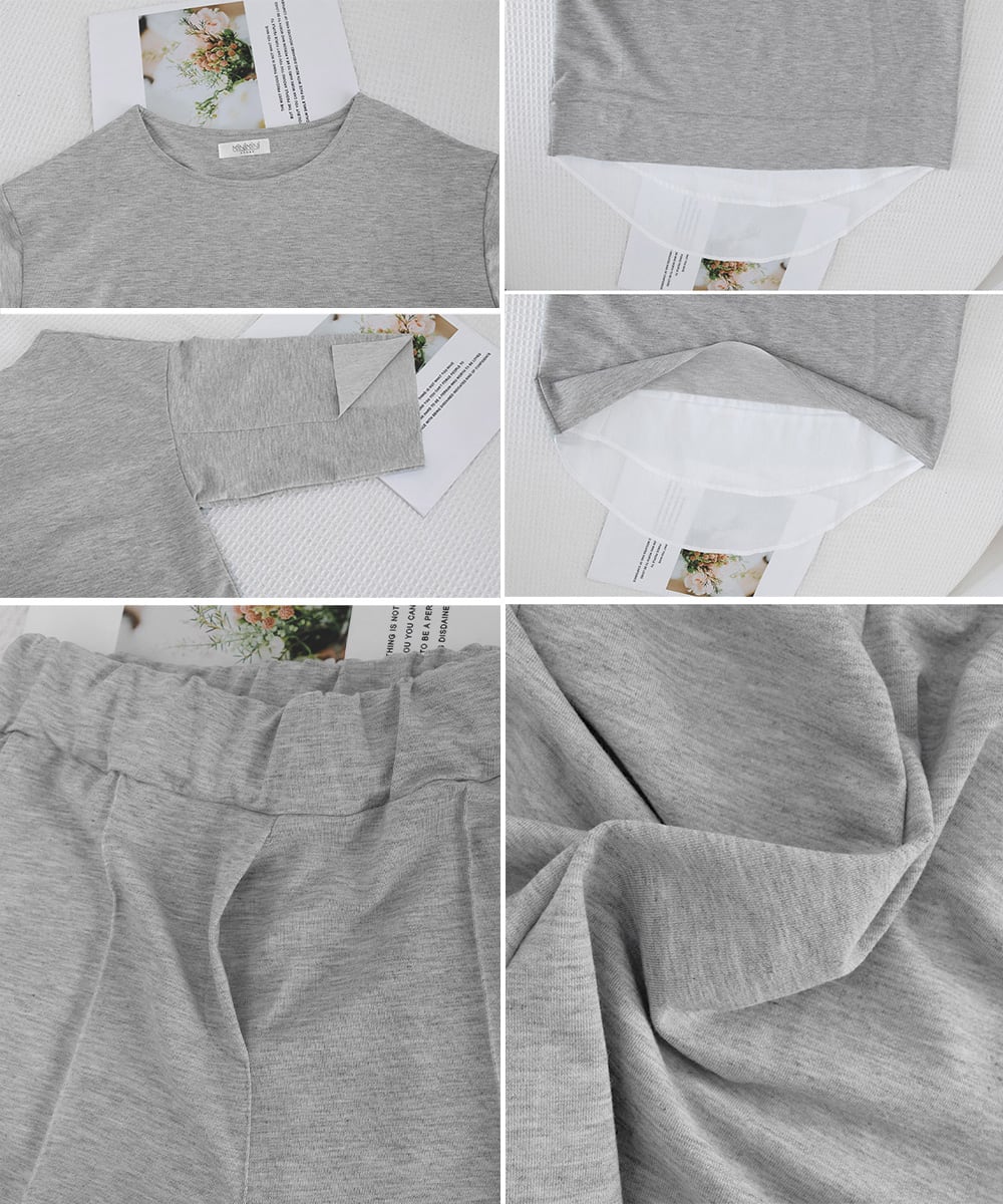 重ね着風トップス シンプル 7分袖スウェットトップス 七分丈センタープレスパンツ 大人カジュア2点セット ゆったり韓国風