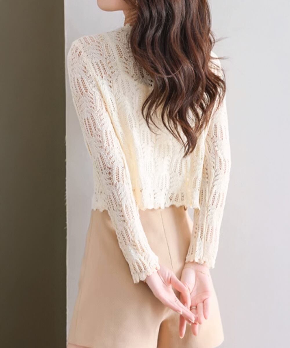 繊細な透かし編みが女性らしさを引き立てる、ショート丈のニットカーディガン。