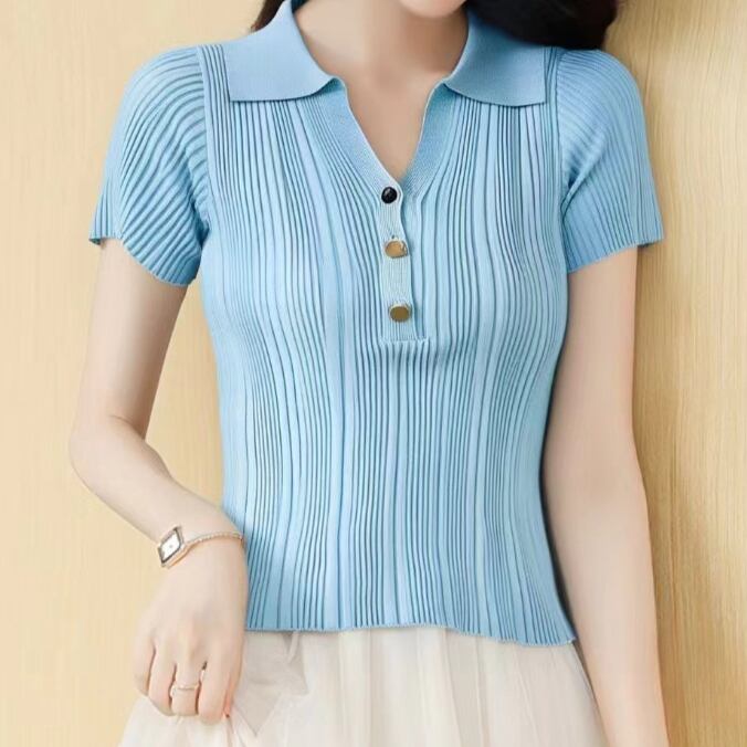 【海外からの取り寄せ】 2025新作 レディース リブニット 襟付きニット 半袖 トップス ポロシャツ 半袖ニット #[shirt511_9800]【送料込み】【250822】