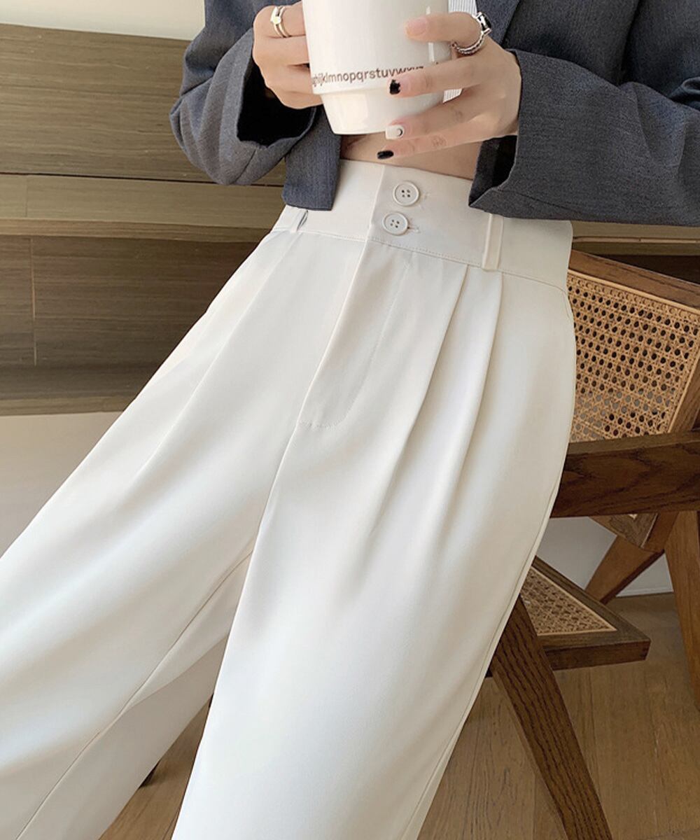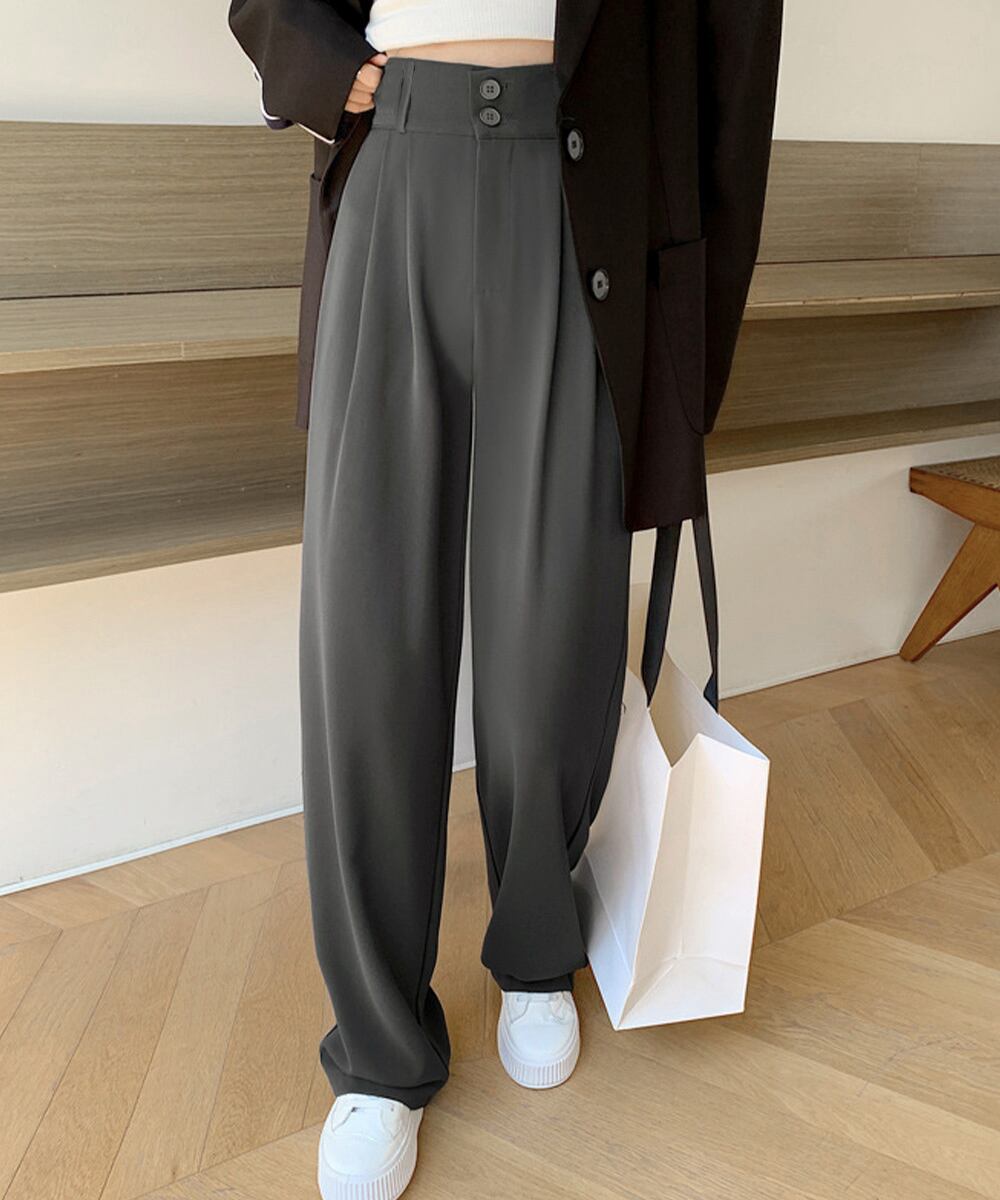 レディース ダブルボタンストレートパンツ オフィスカジュアル 着やせロングパンツ ハイウエストイージーパンツ バックゴム