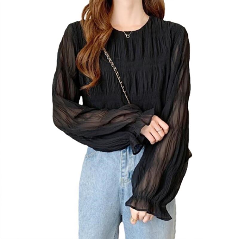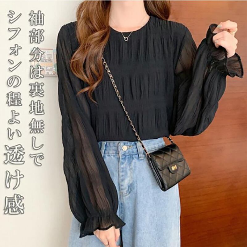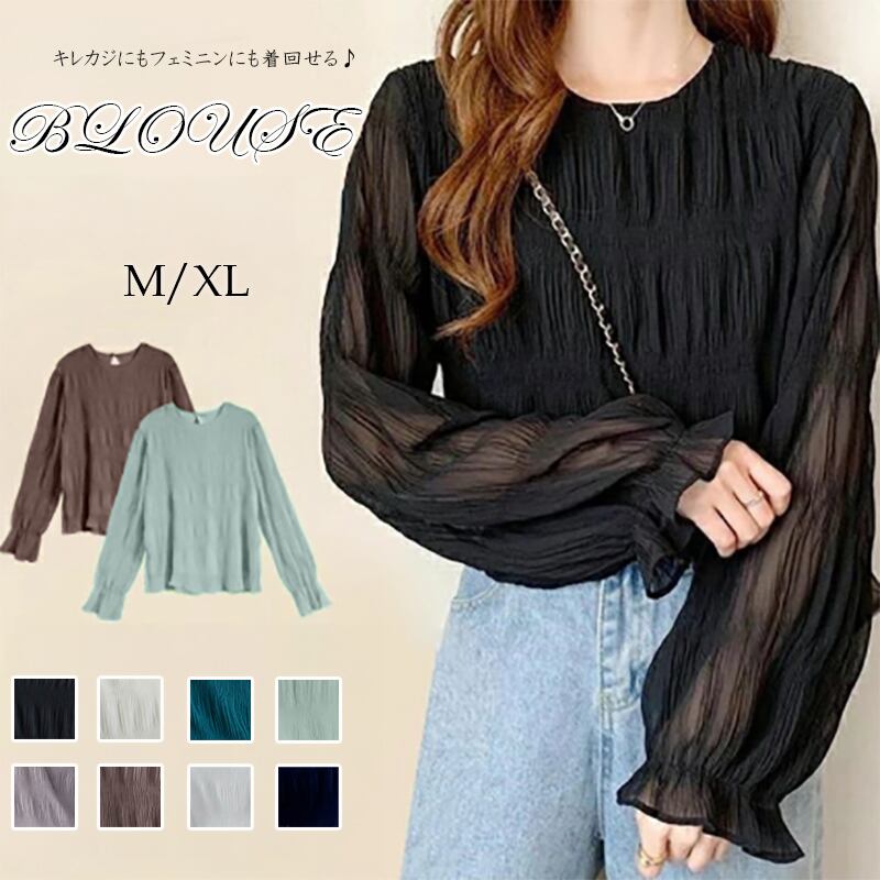 【海外からの取り寄せ】 新作 シャーリング シアーブラウス ラウンドネック 長袖 レディース きれいめ #[tops674_18800]【送料込み】【250826】