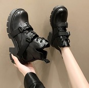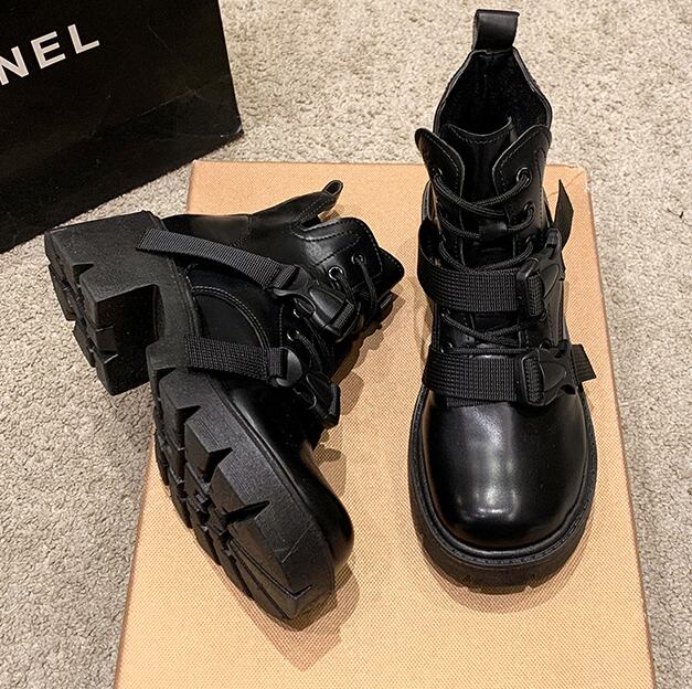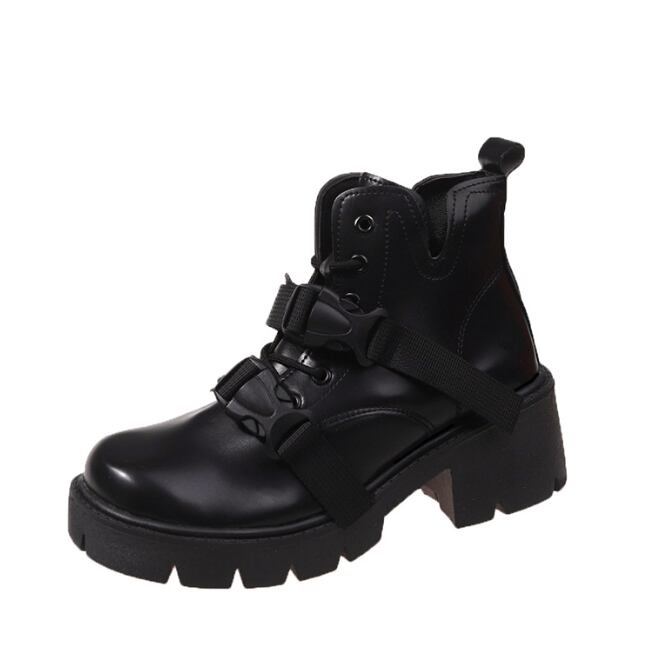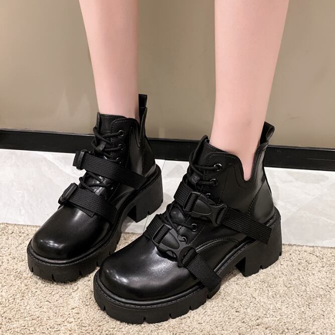 【海外からの取り寄せ】 レディース 靴 ミドルブーツ ダブルベルト厚底ブーツ 黒 美脚 ショート カジュアル #[boots375_18800]【送料込み】【250905】
