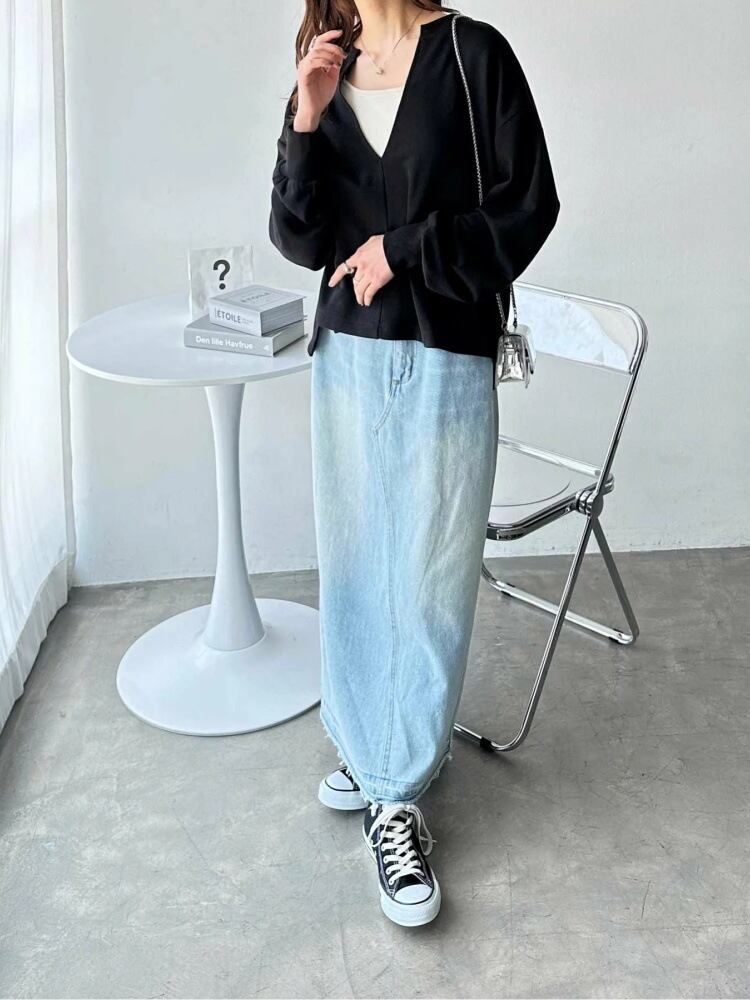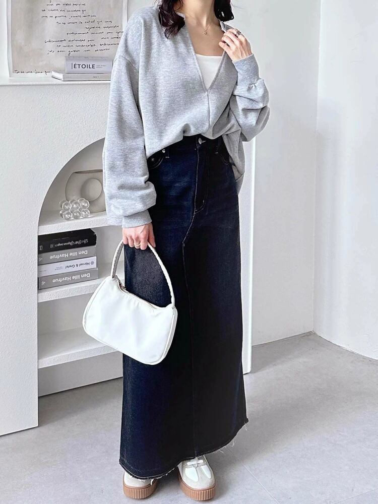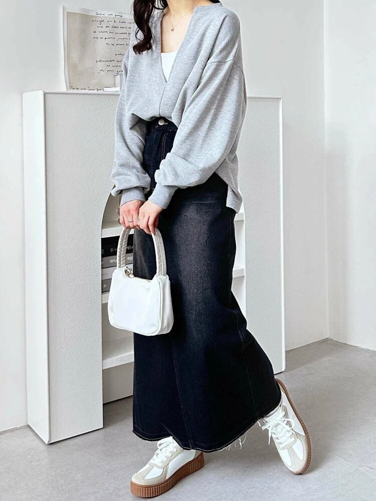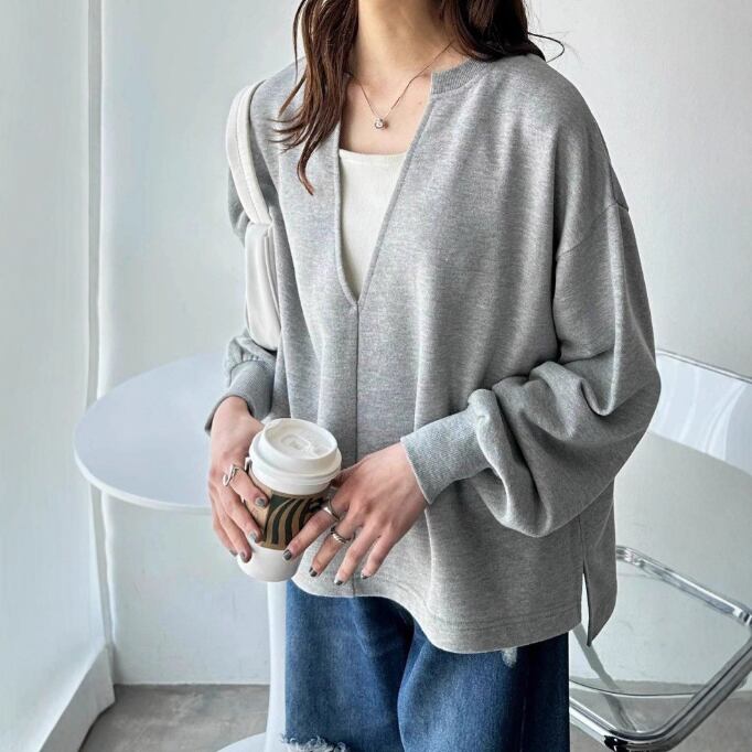 ・深めに開いたVネック&ゆったりシルエットが抜け感を演出。