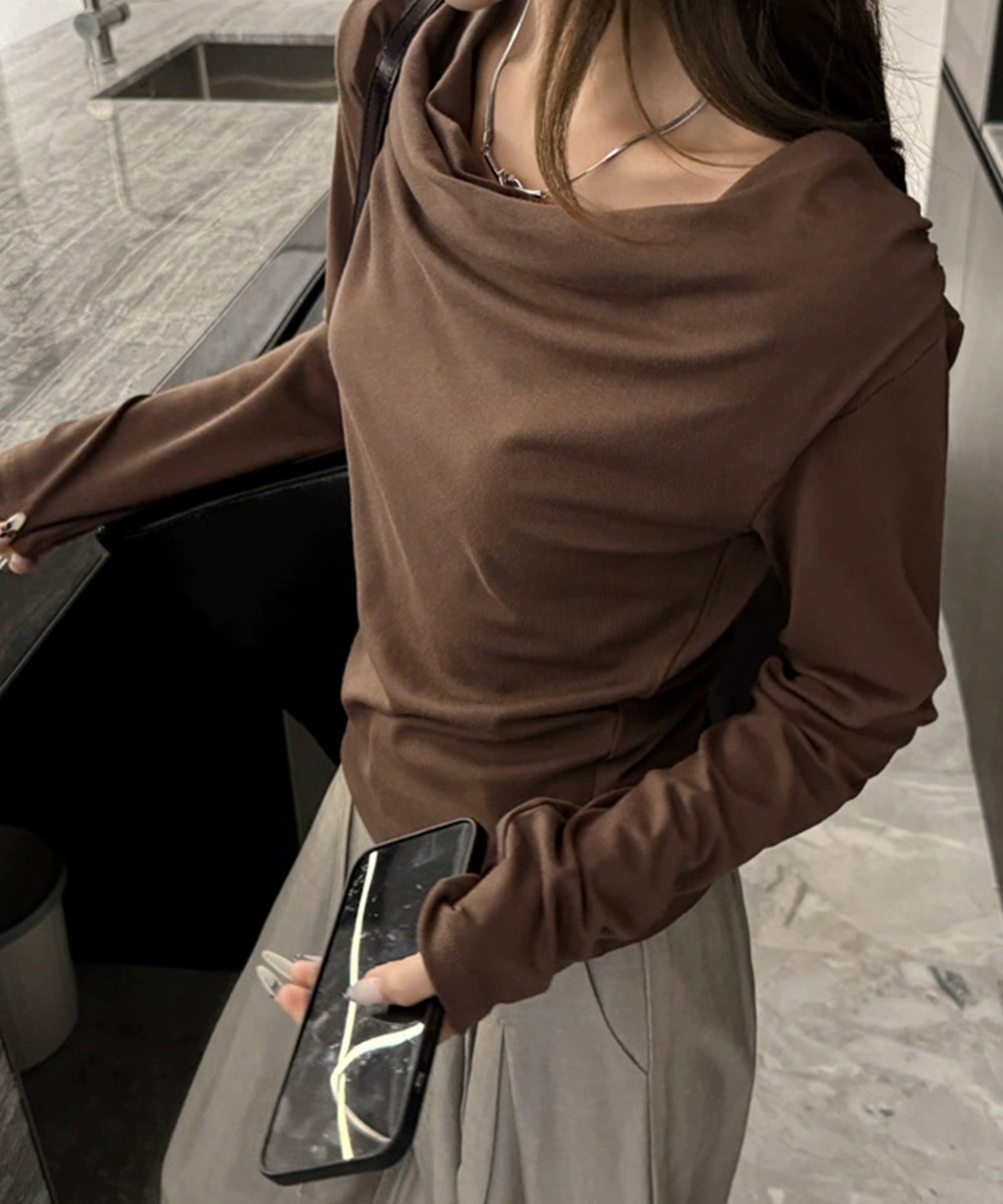 深めのドレープネックが、抜け感と大人の色気をプラス。