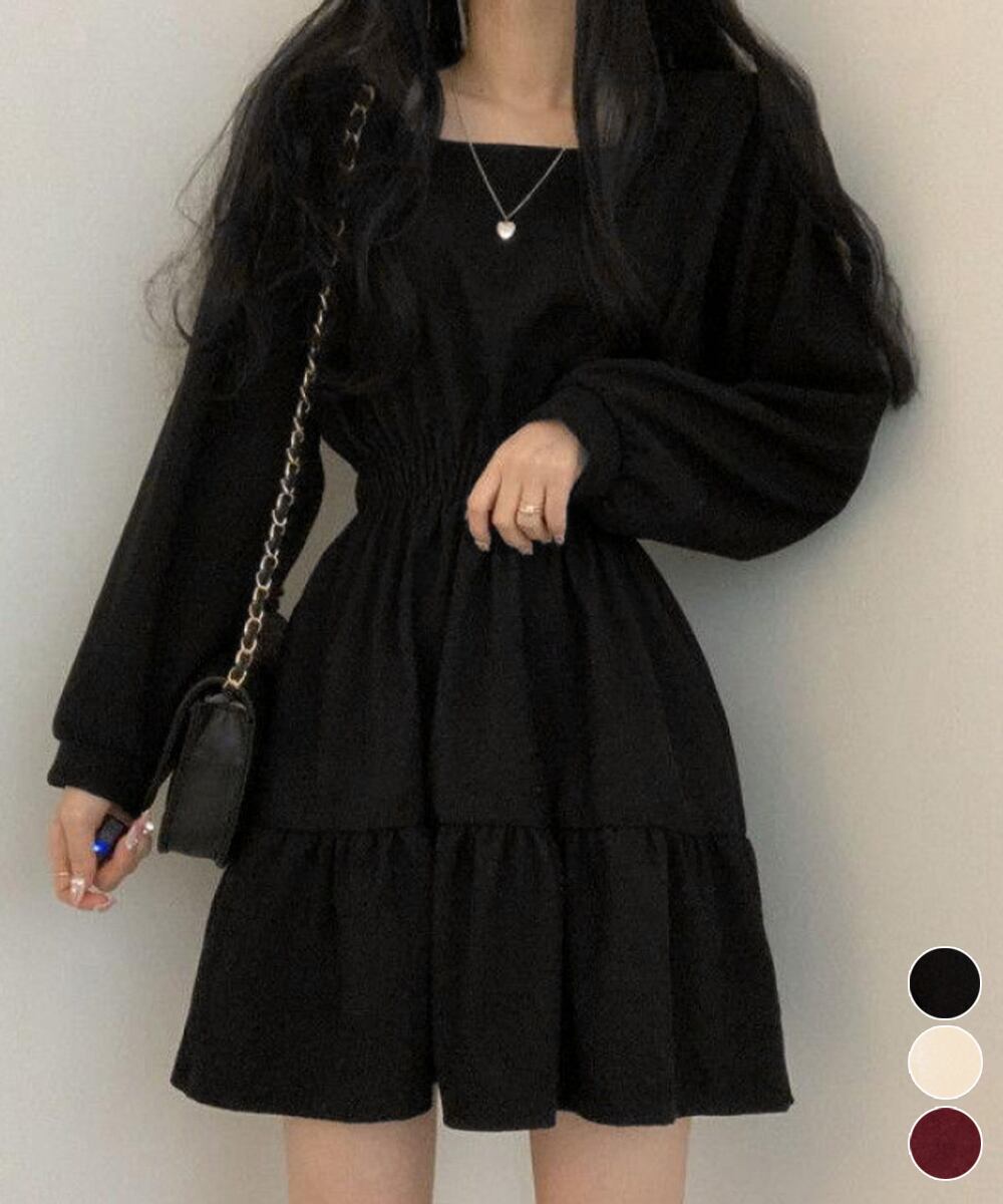 スクエアネック長袖 韓国風ワンピース黒 ガーリーワンピース